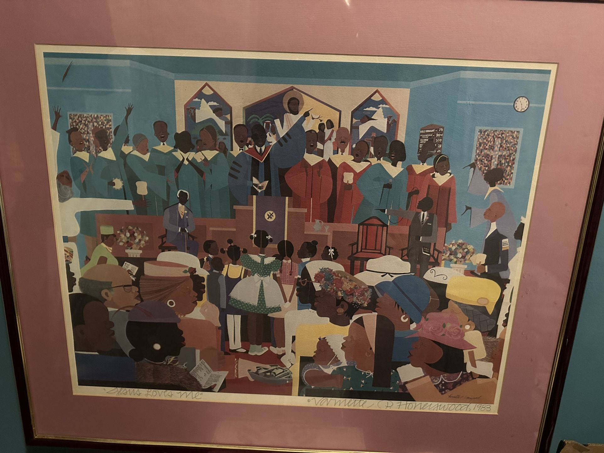 VARNETTE P. HONEYWOOD, 1(contact info removed), JESUS LOVES ME Honeywood, Varnette P. (1(contact info removed)) 1983 color lithograph 17-1/2 x 23 inches (image) signed, titled and dated in pencil Condition generally good condition; no holes, tears, or stains. mat burn. paper discoloration on reverse. stains on mat