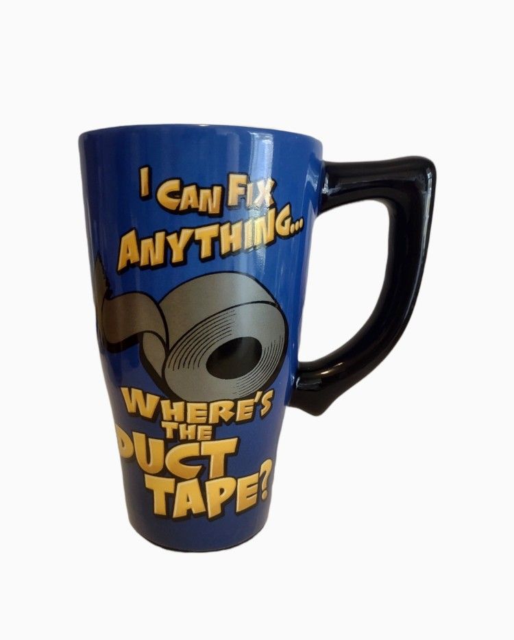 This is an oversized tall blue mug. It in excellent condition. It says, " I can fix anything, where's the duct tape". This would be a great gift for any handy person. It has a non slip bottom. It measures 6 1/4" tall.