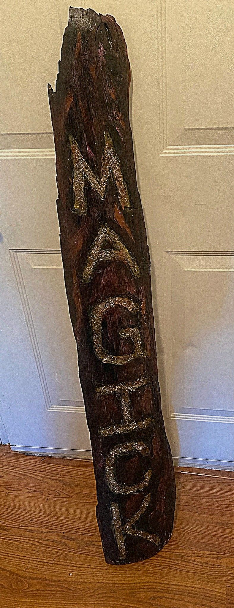 Handmade Magick sign for decor. It is about 3 feet tall and 6 inches wide. Made for inside or outside use out of driftwood, wood burning and shellac to seal it. Very fun peace to add to a fairy garden or window display etc.