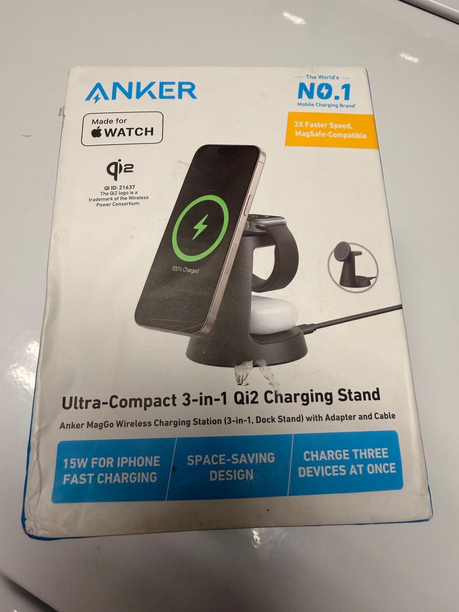 Anker MagGo 3-in-1 Qi2 Wireless Charging Stand β Open Box, just open it for testing and it works Perfectly Fast, ultra-compact wireless charging station charges your iPhone (Qi2/MagSafe), Apple Watch, and earbuds all at once. Compatible with Qi2 standard for fast wireless charging. β‘ Qi2 Certified 15W wireless power π± Chargers for phone, watch, earbuds Great tested condition β everything works! Asking $55.00