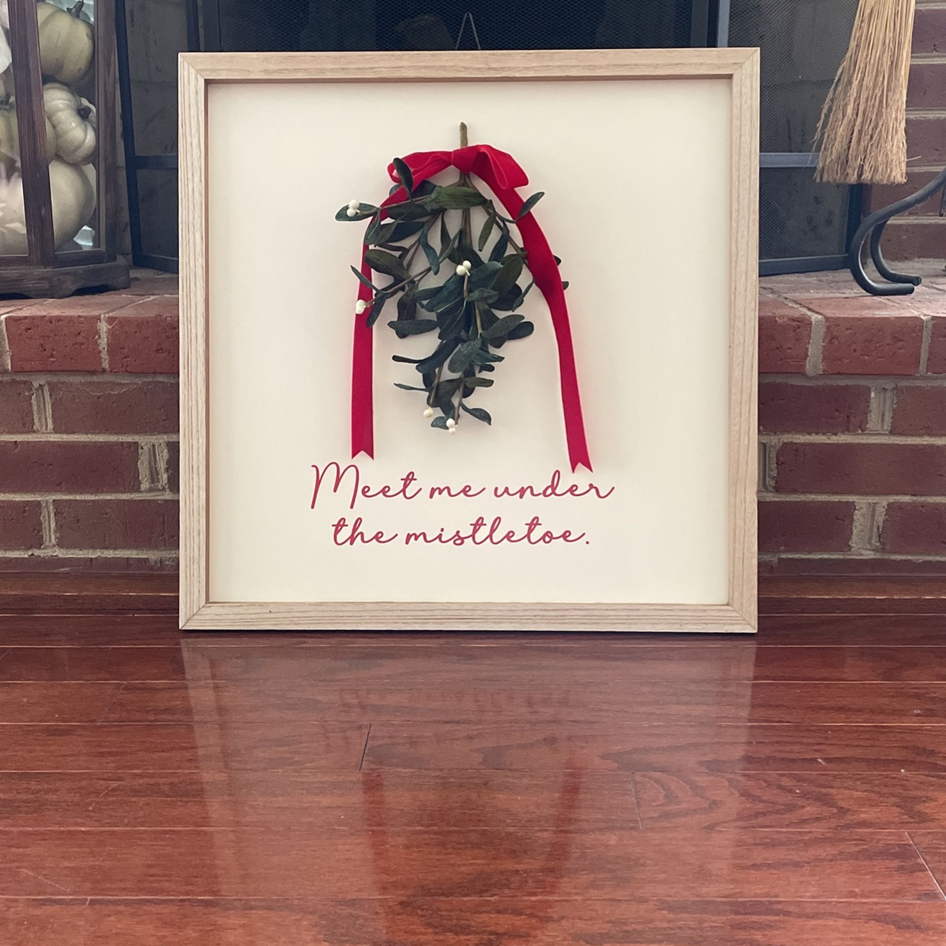 Meet Me Under The Mistletoe Christmas Sign, has hook ready for hanging. 22”x22”. So cute, looks like real mistletoe.