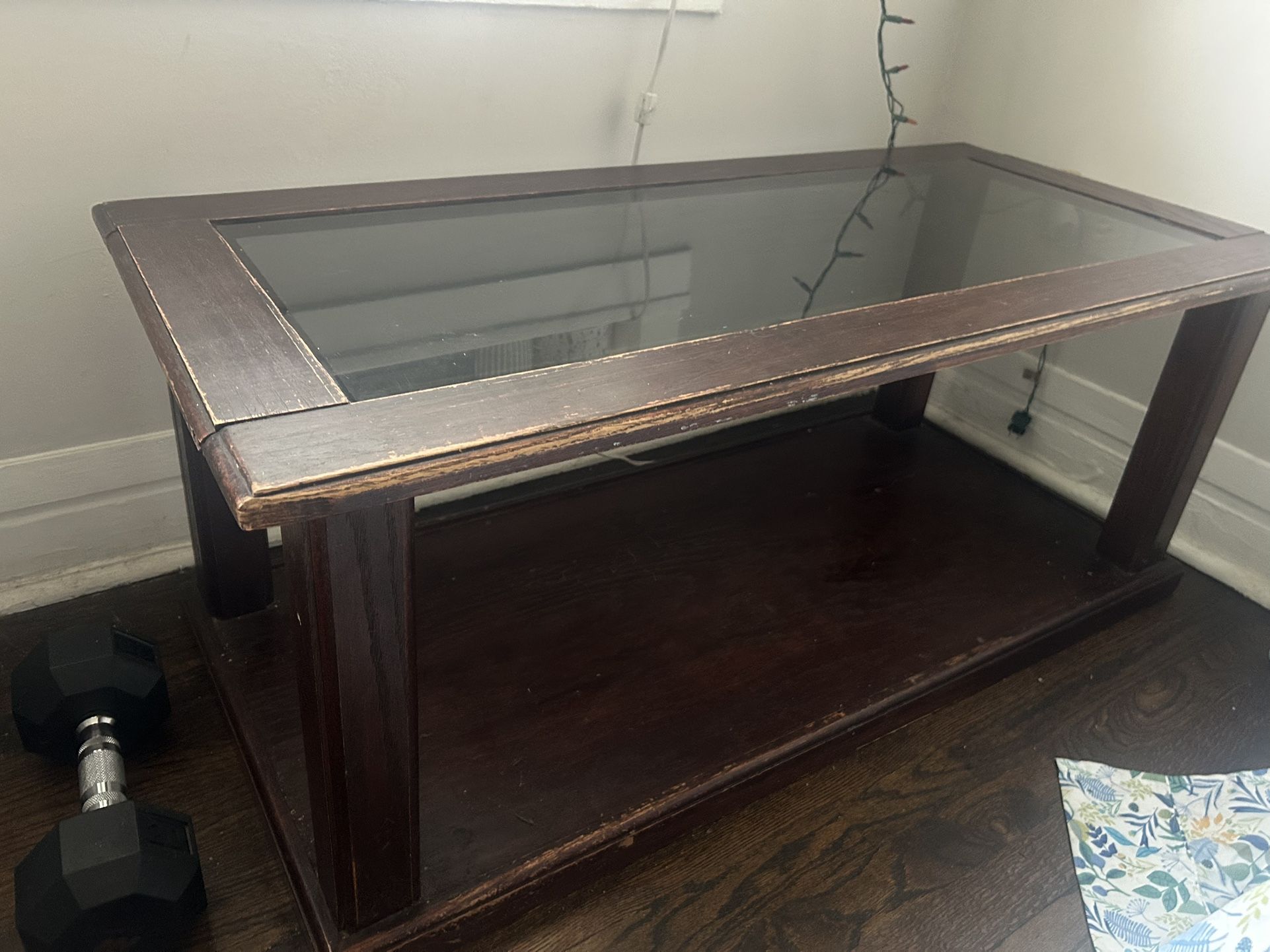 Solid wood coffee table with a glass insert top. Dark wood finish with a lower storage shelf – perfect for books, baskets, or décor. Table has some wear and scratches on the edges (see photos), but it’s sturdy and functional. Pick up asap, moving soon