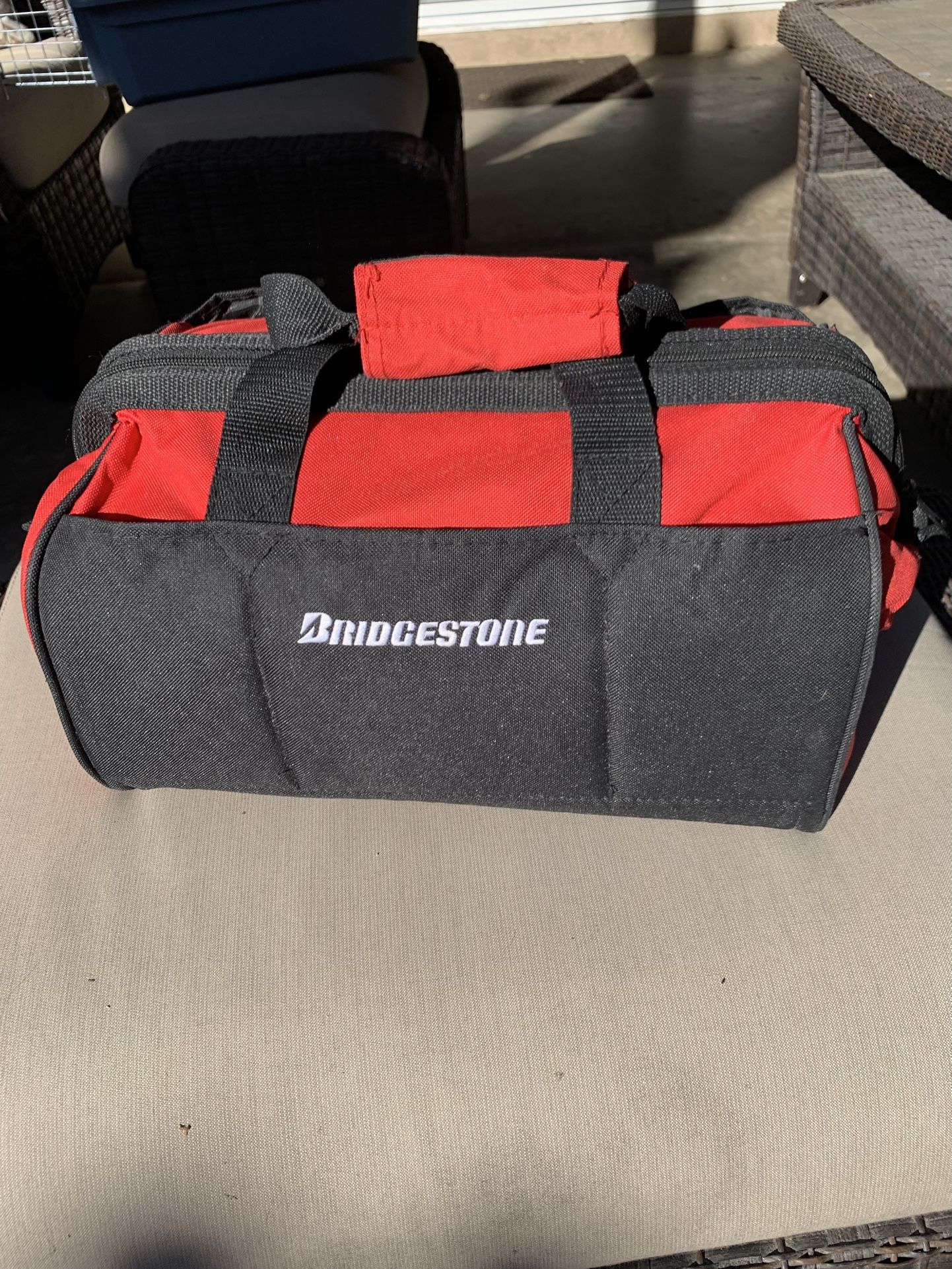 BRAND NEW in the bag! Bridgestone Auto Safety Emergency Roadside Kit. Comes with all original items, unused. 300 psi air compressor comes with attachments for bicycle tires, sports balls, inflatables and more. Includes batteries for flash light. First aid kit, duct tape, screw driver, poncho rubber gloves, reflective safety triangle and more.