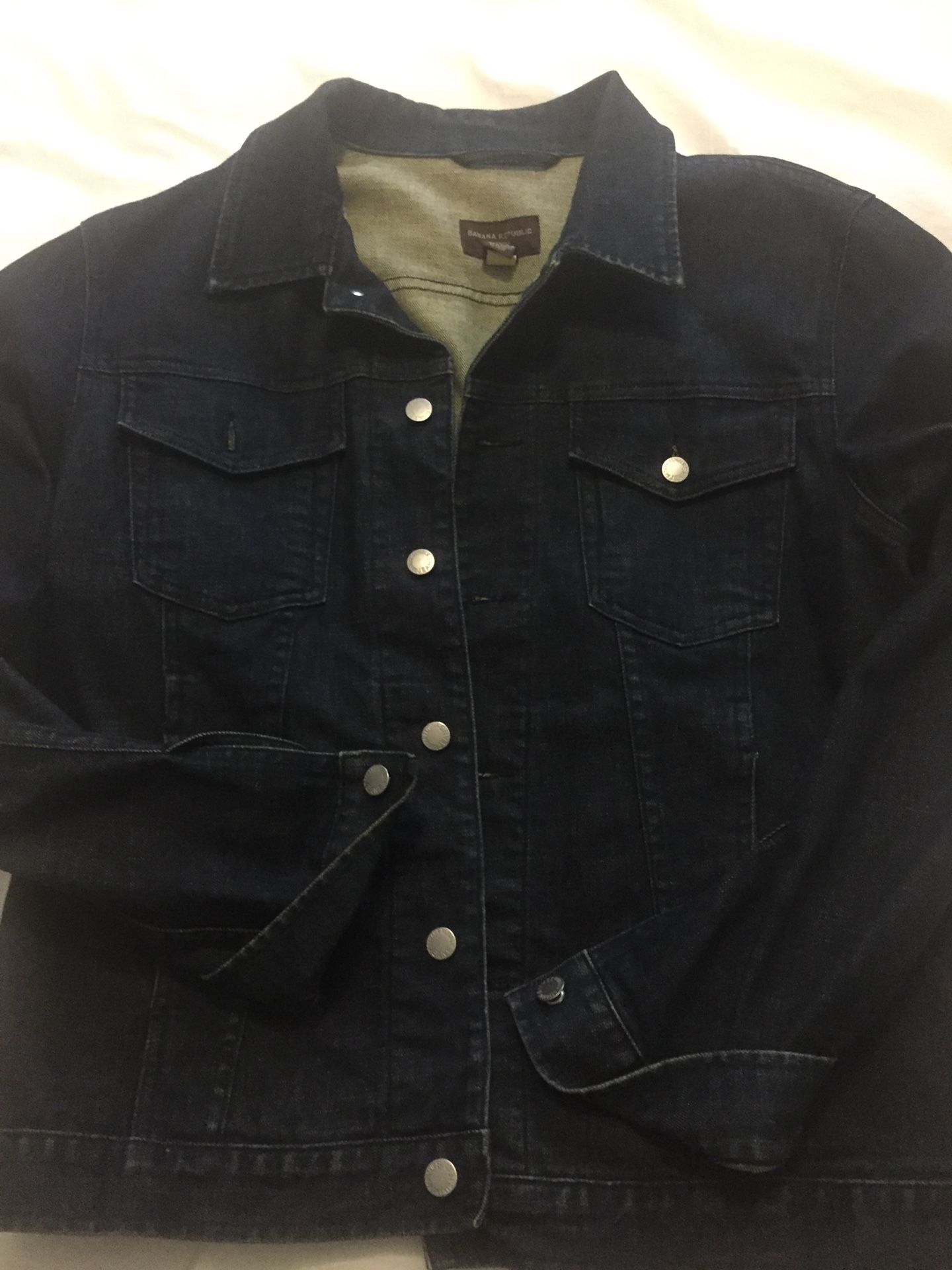 In new condition, very nice dark blue denim jacket. This jacket is discontinued by Banana Republic.