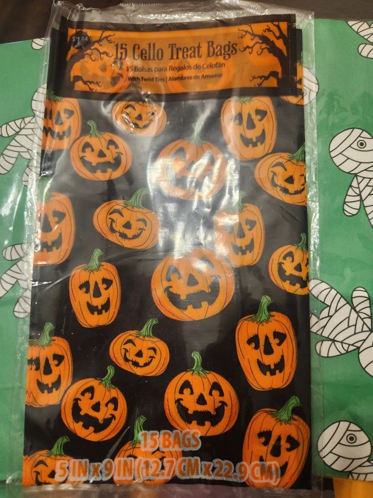 Perfect for party favors, classroom treats, trunk-or-treat, or crafting. Clean, unused, and ready to go. 🕸️ What’s Included: - 2 unopened packs of Halloween paper treat bags (mummy pattern) - 1 open pack of Halloween paper treat bags (mixed designs: pumpkins, bats, witches, ghosts, spiders) - 1 unopened pack of 15 cellophane treat bags (jack-o’-lantern design) 🍬 Condition: - All new or like-new - Clean, no bends or damage - Colors crisp and bright 🎯 Price $7 total — take the whole bundle.