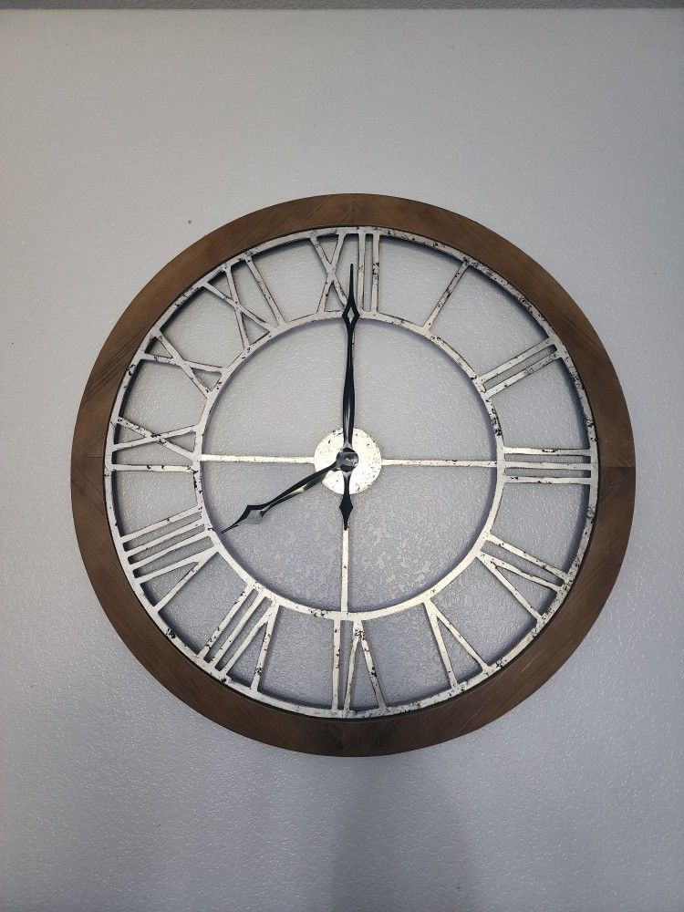 This wood frame large wall clock 36.5 inches in diameter rustic in design. I am asking 75.00 or the best offer.