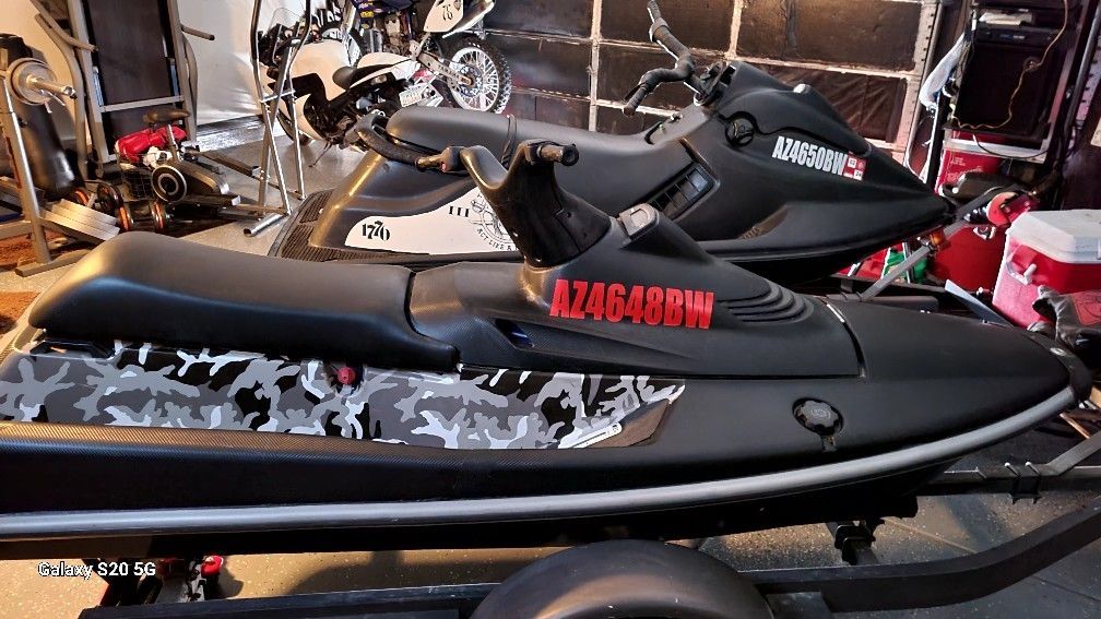 I could use the extra Garage space. The yamaha water muffler replaced 01/08/2025. . Yamaha VXR Pro 700 a 2-stroke, 701cc, reed-valve, single-carb, twin-cylinder “701” Yamaha marine engine that delivered 64hp at 6250 RPM. 580cc, oil-injected, 2-stroke twin marine engine cranked out 56 HP and ensured a top speed of 45 mph under ideal conditions. 1994 Sea-Doo SPX: Engine: 70 horsepower, 650 cc displacement, gasoline-powered Hull: Fiberglass Beam: 3'5" Length: 8' Net weight: 395 lbs Both start and run fast with no issues. The wrap is about 3 plus years old and not professionally done. Looks decent and better than the custom faded paint job. 2023 replaced rubber plastic bumper all around on Yamaha and on the SPX new Traction Matt. Owned for over 5 years. Always keep them maintained and stored in garage. Trailer has new lights and 3 tires. As long as the batteries are charged you can expect to have fun in the sun..