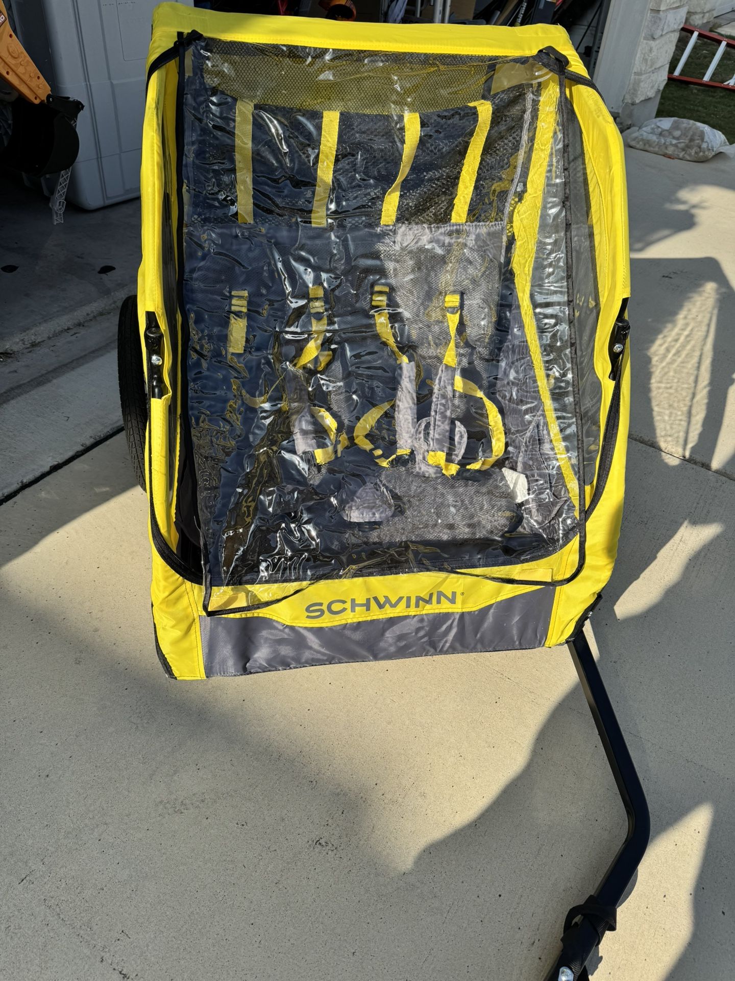 Schwinn double bike trailer in great condition. • Seats up to 2 kids • Includes clear weather/rain cover • Safety harnesses intact • Smooth-rolling wheels • Folds for storage • Clean and well cared for Perfect for bike rides, parks, or family outings. Kids have outgrown it. Pickup only. Cash preferred.