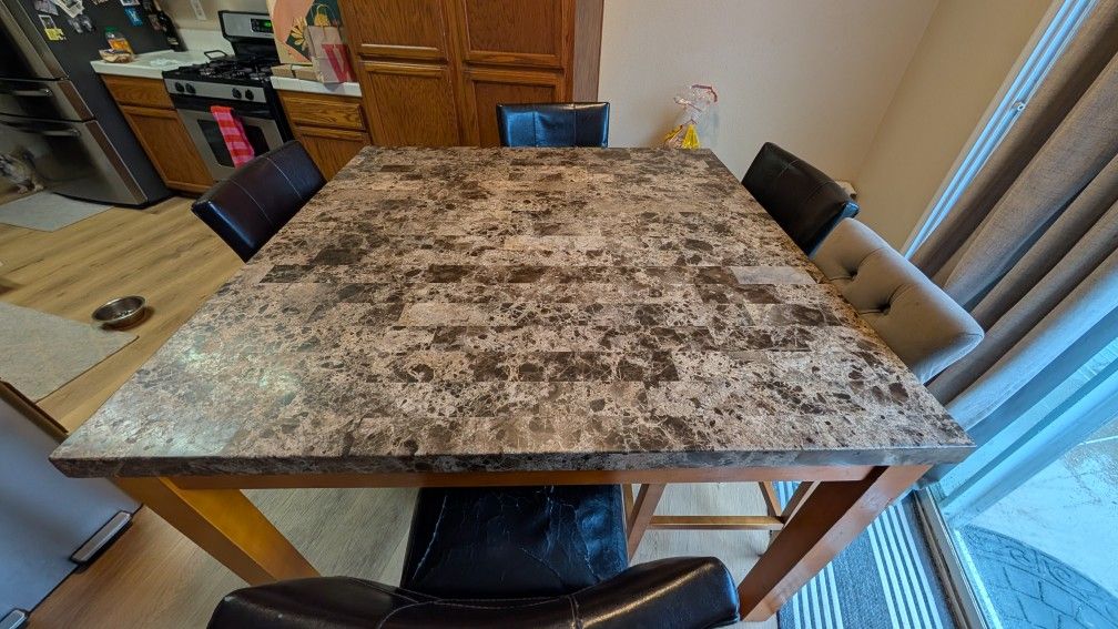 Used larger square dining table and chairs. Some chairs have heavy wear. 5 chairs total Table is 54" x 54" Height is 36" Available now