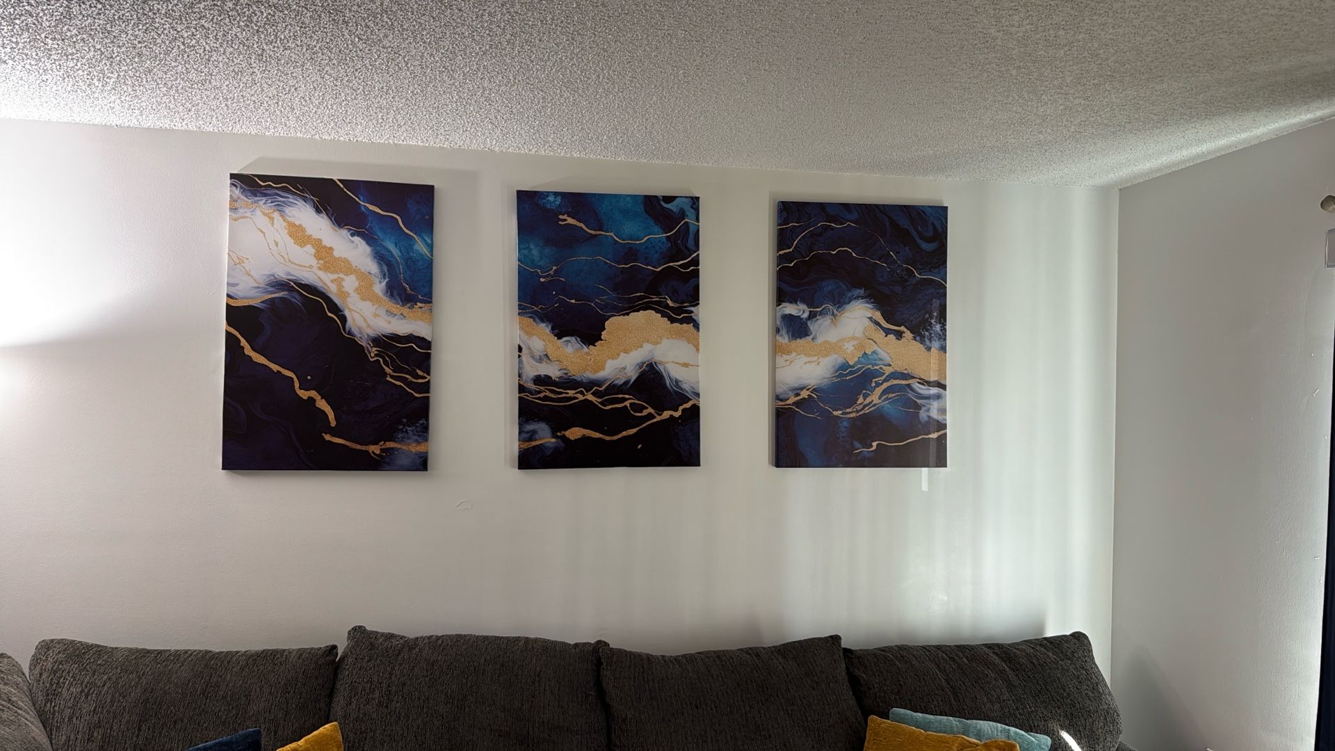 3pc wall art pieces. Color: Navy blue, White & Gold
