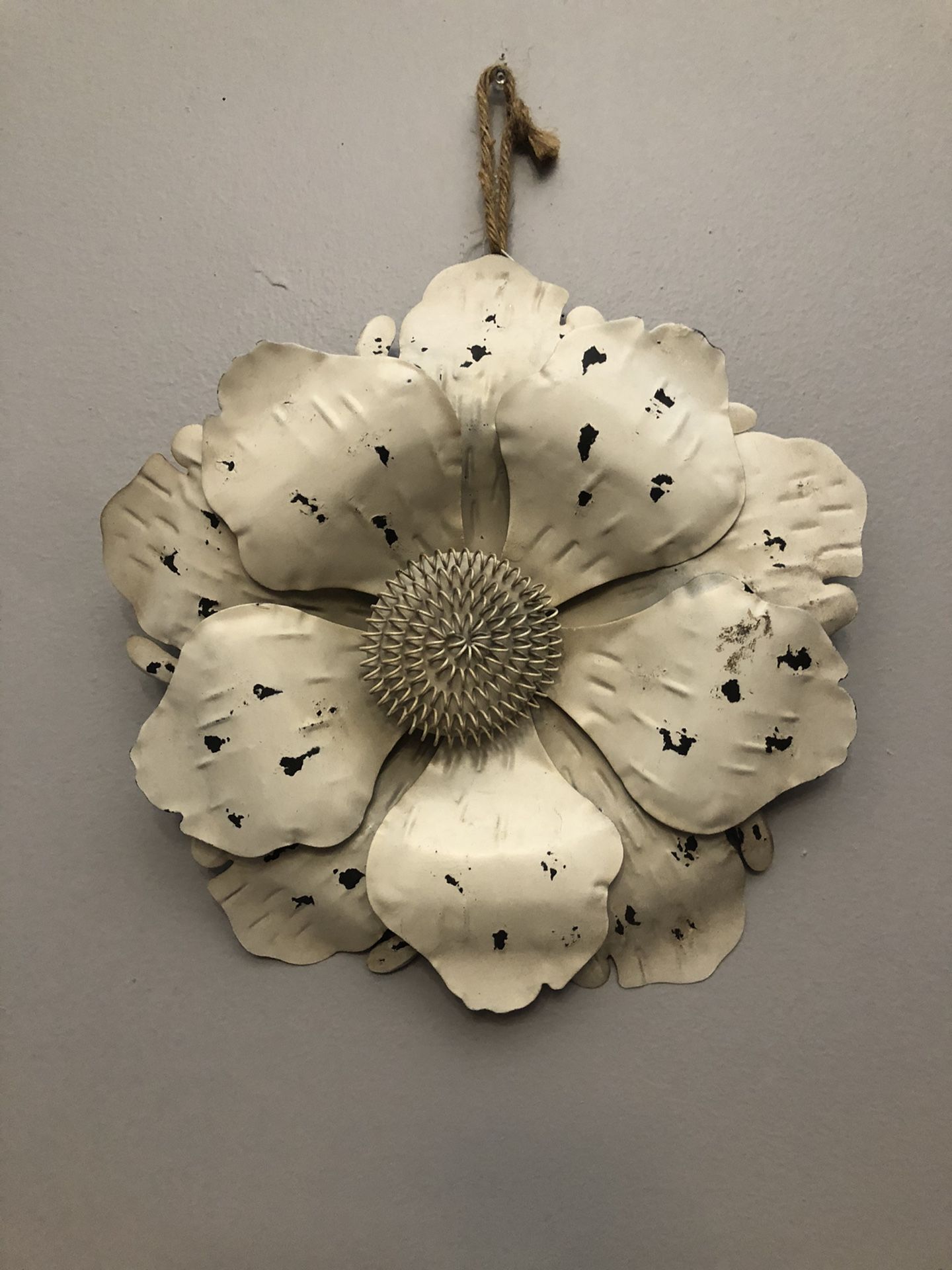 This metal flower is perfect to put on your door as a wreath, or outdoors, or even in your home! It is a creme color and is rustic. When you purchase multiple things from my page I will be so happy to give you a good deal!!