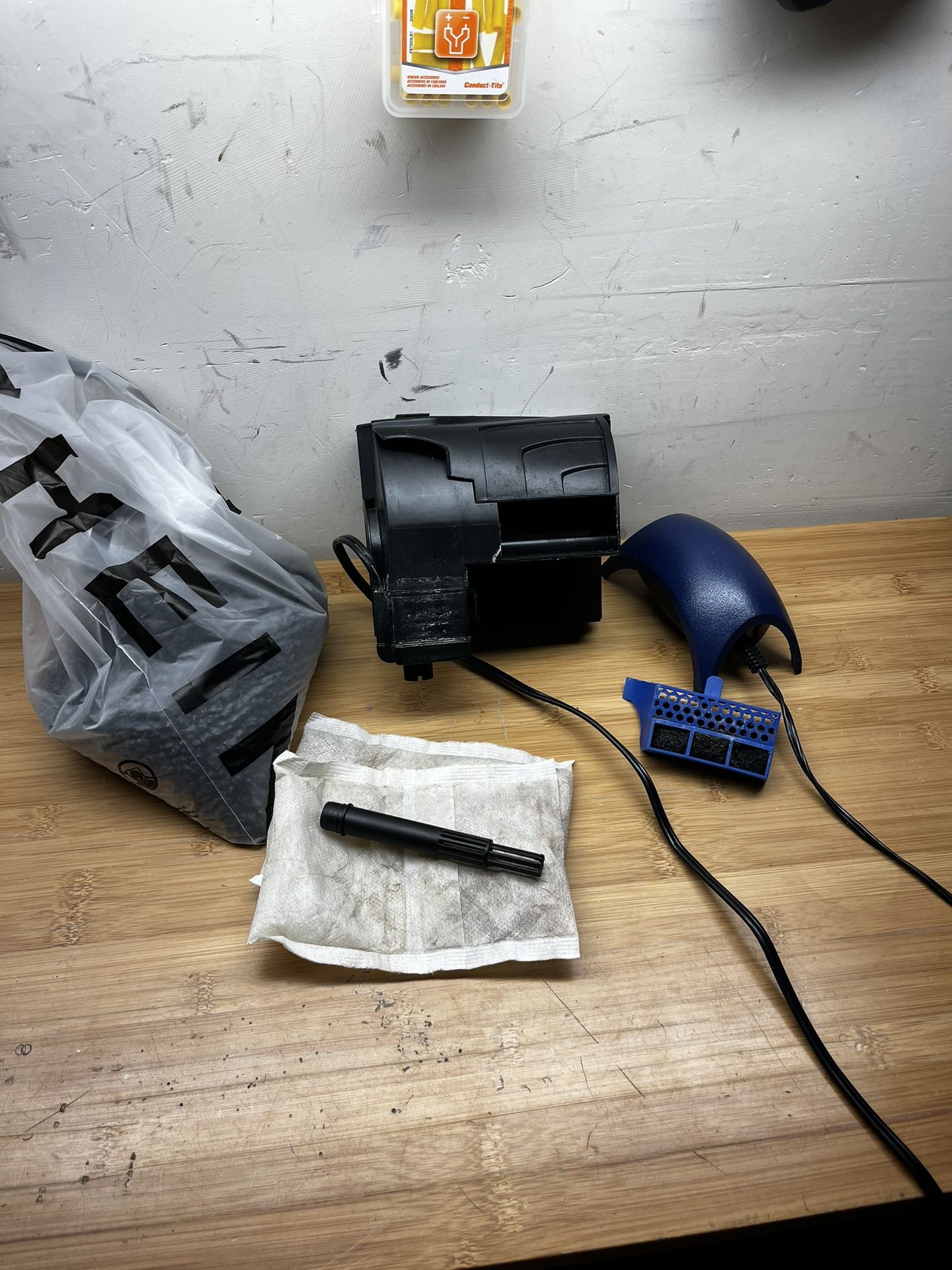 I have here some accessories for Your fish tank including a filter that is good from 10 to 30 gallons as well as a cover for a 15-20 gallon tank or depending on top size may fit can test also a air pump for volcanoes or any other decor I have black gravel and two water softeners Lmk what you need π