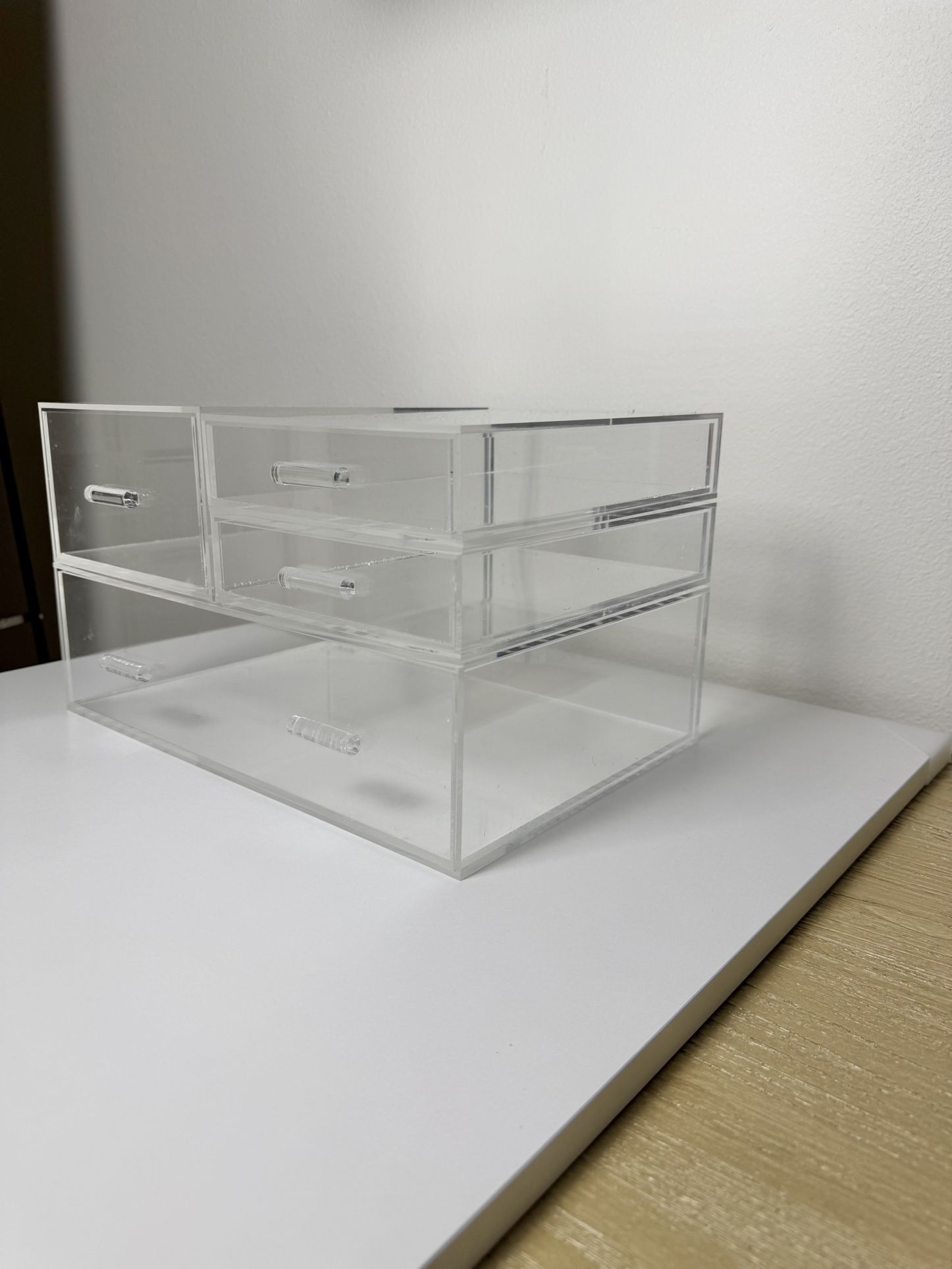Luxe Acrylic Organizers/drawers purchased from the container store. Can be used for makeup or bathroom storage etc.