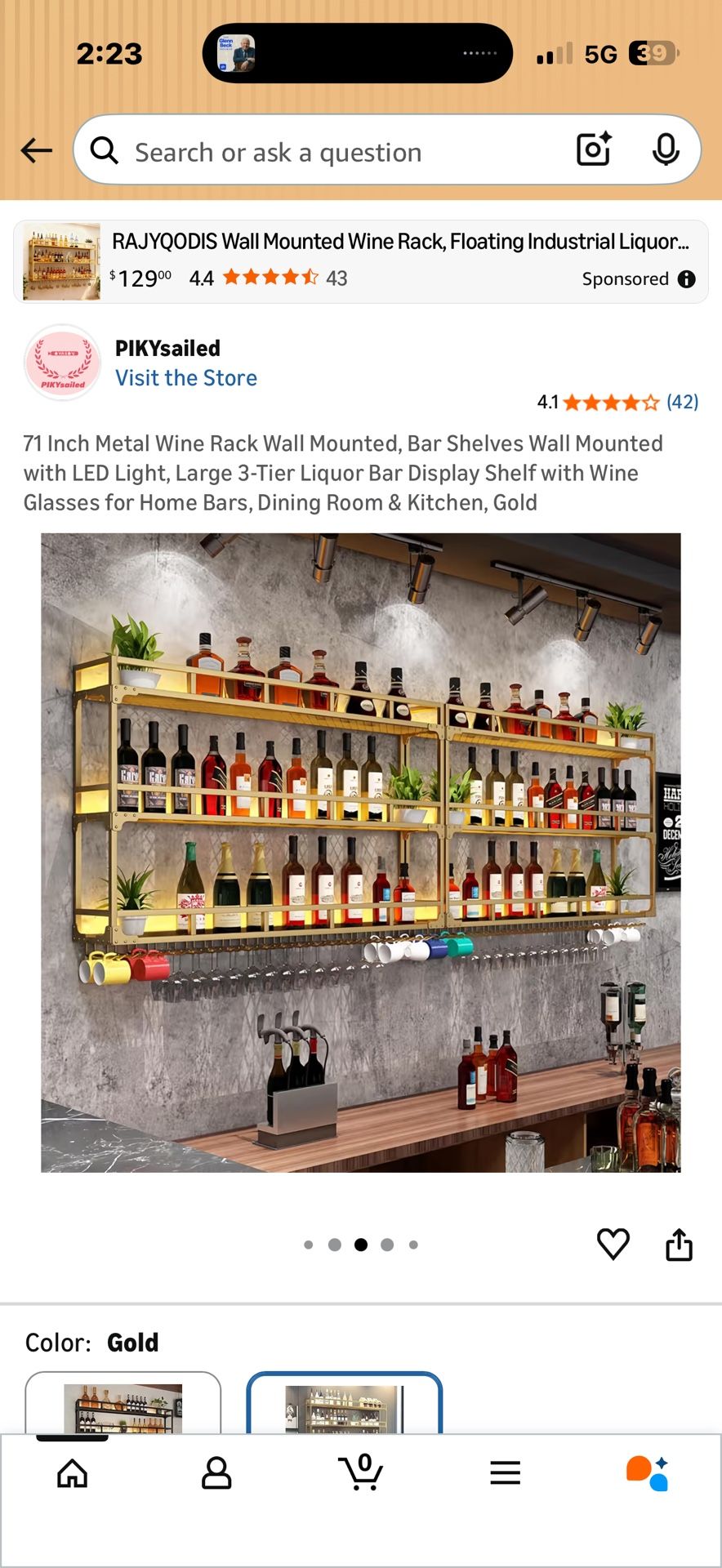 New large 71” gold wall mounted liquor rack, or wine rack LED lights
