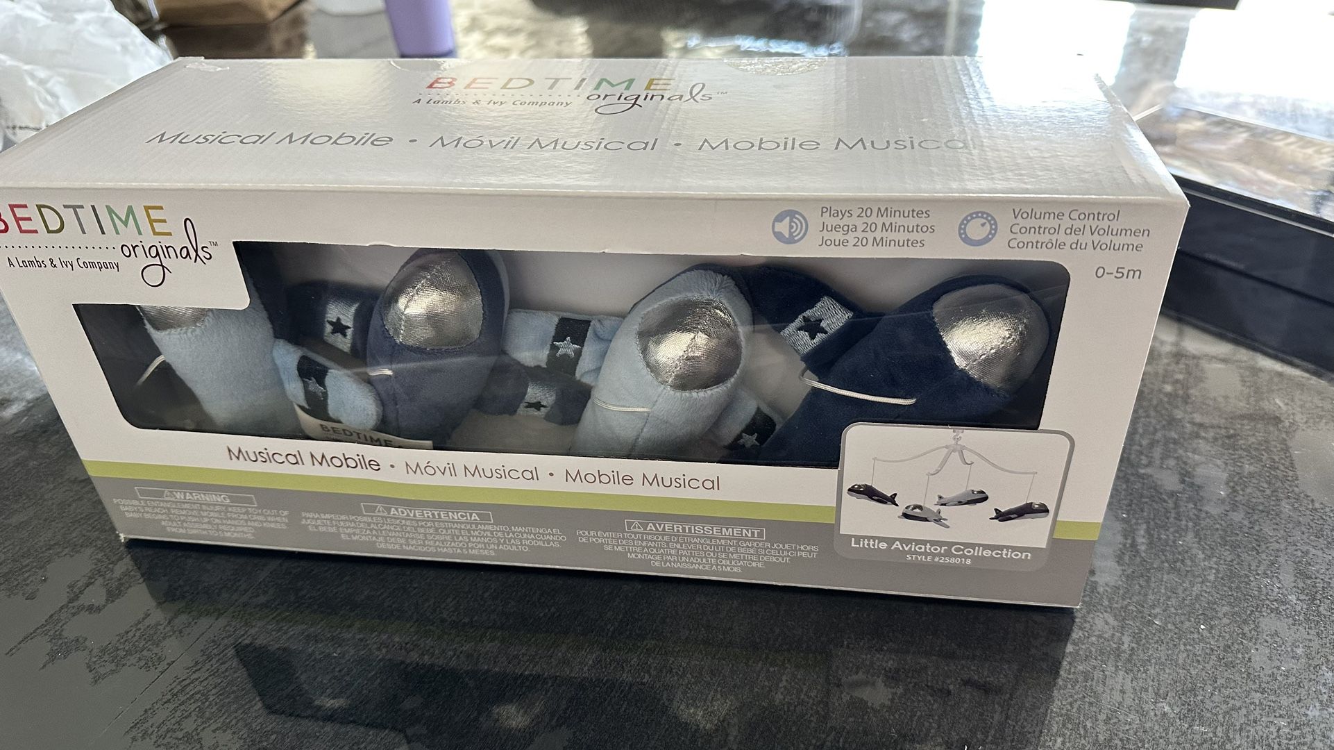Brand new in box airplane mobile by Bedtime Originals. Plays music. Adorable, just ended up going with a different theme for our son’s nursery. Paid $50