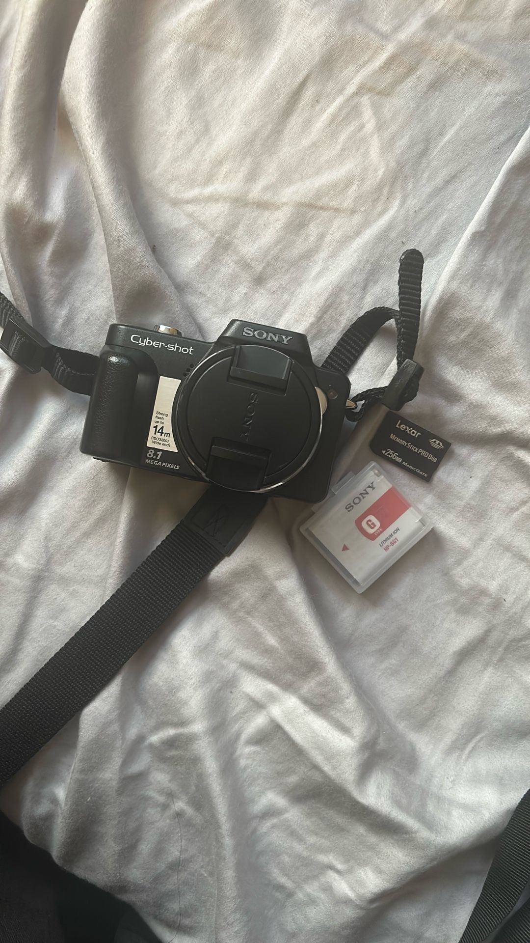 Sony cyber shot camera wth 2 sd cards (1gb and 256mb) Strap Extra battery No charger but available on Amazon