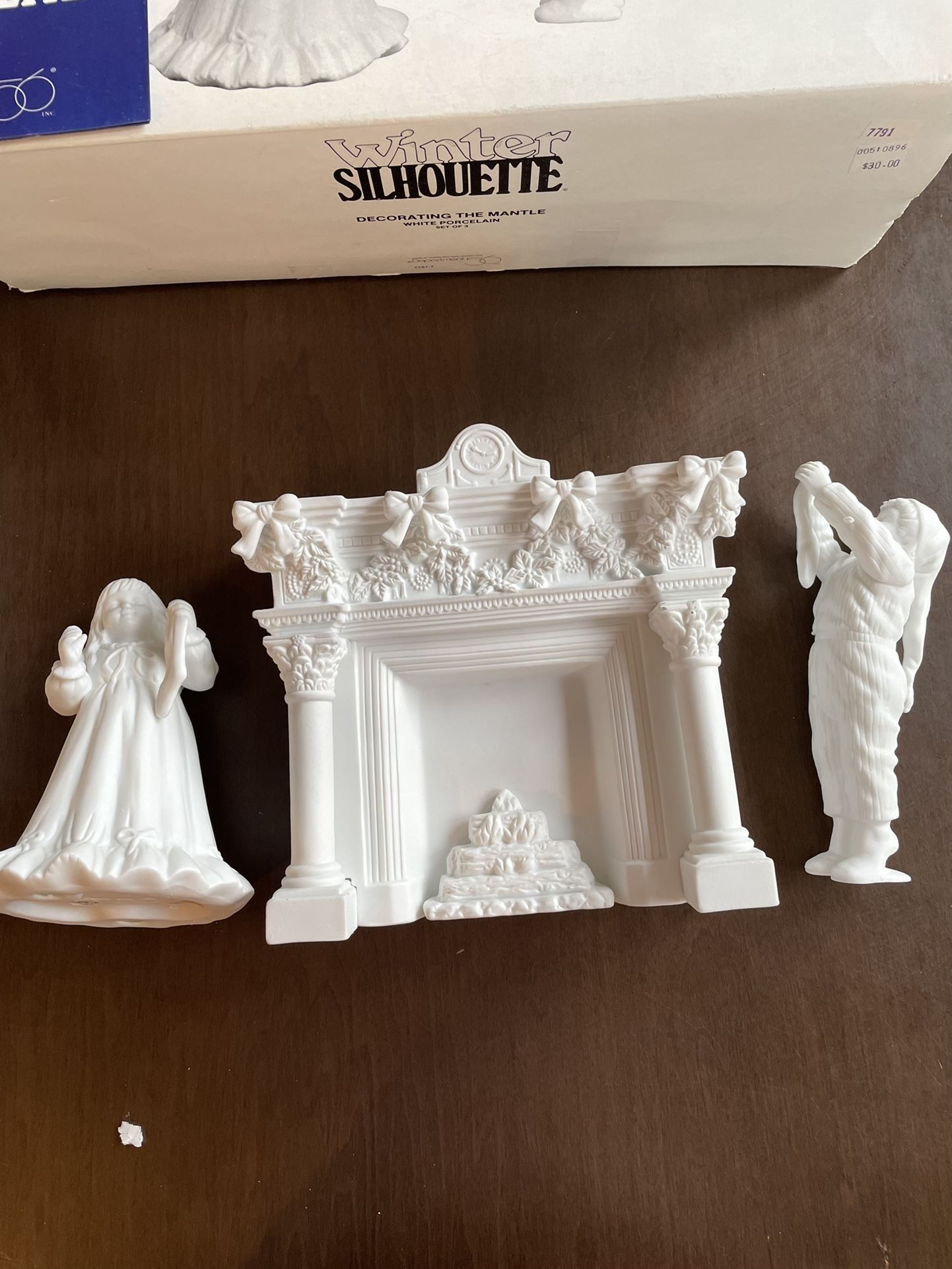 RETIRED Dept 56 WINTER SILHOUETTE DECORATING THE MANTLE WHITE PORCELAIN FIGURINE. Mint condition Except candles on top are missing
