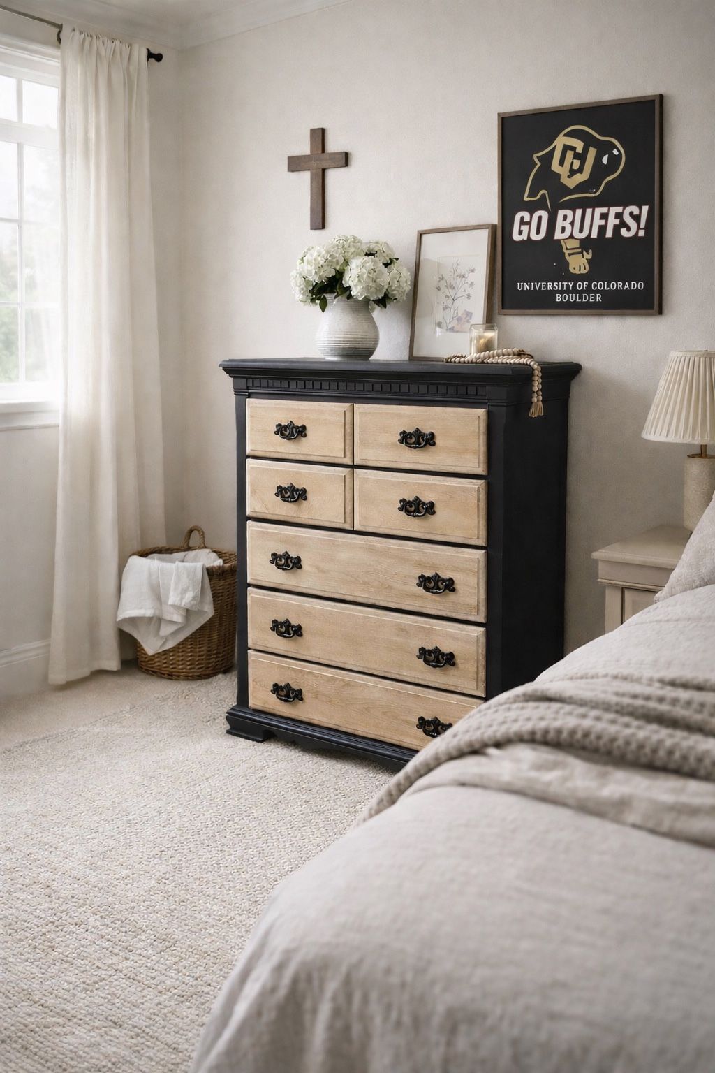 Beautiful 6-drawer dresser with a stylish two-tone farmhouse design. The black frame contrasts nicely with the natural wood drawer fronts and decorative hardware, giving it a clean, modern look that works well in many bedrooms. Very solid and sturdy with plenty of storage. Perfect for a bedroom, guest room, or entry space. Dimensions: • Width: 37 inches • Depth: 18 inches • Height: 53 inches All drawers slide smoothly and the dresser is in great condition.