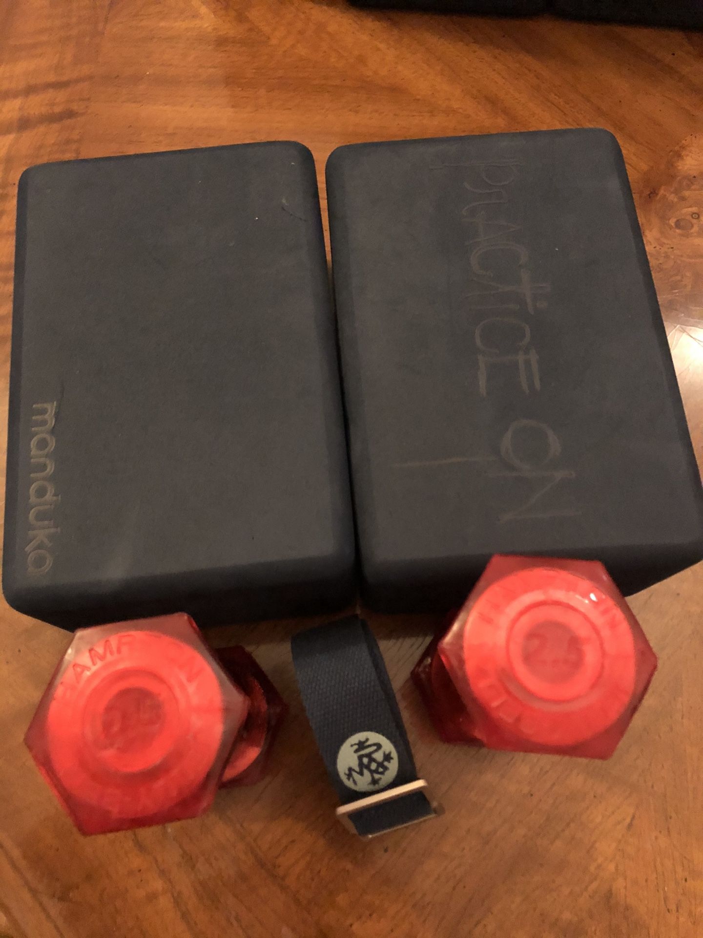 Manduka yoga block consists of over 50% to 70% recycled Eva foam of high density ; it provides unbeatable comfort, style and support, comfortable grip and it also slip resistant . This set is made of : 2 - Yoga blocks 4” W x 9” L x 6” H 1 - 8” strap Two- 2.5 lbs Hampton Jelly Bell urethane aerobic dumbbells.