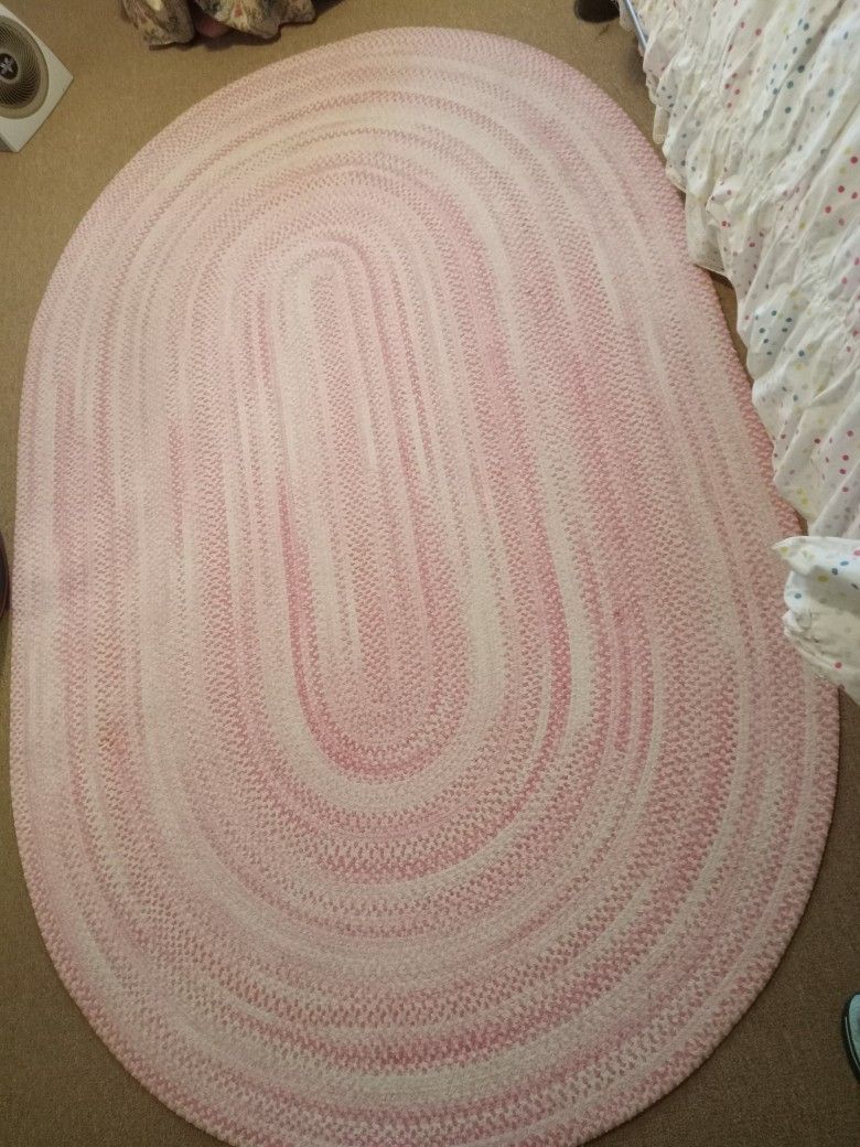 5x8 OVAL - WHITE AND PINK REVERSABLE USED ON ONE SIDE - STILL IN NICE SHAPE OTHER SIDE IDENTICAL - UNUSED SO TWO RUGS FOR PRICE OF ONE RETAILED $600 POTTERY BARN