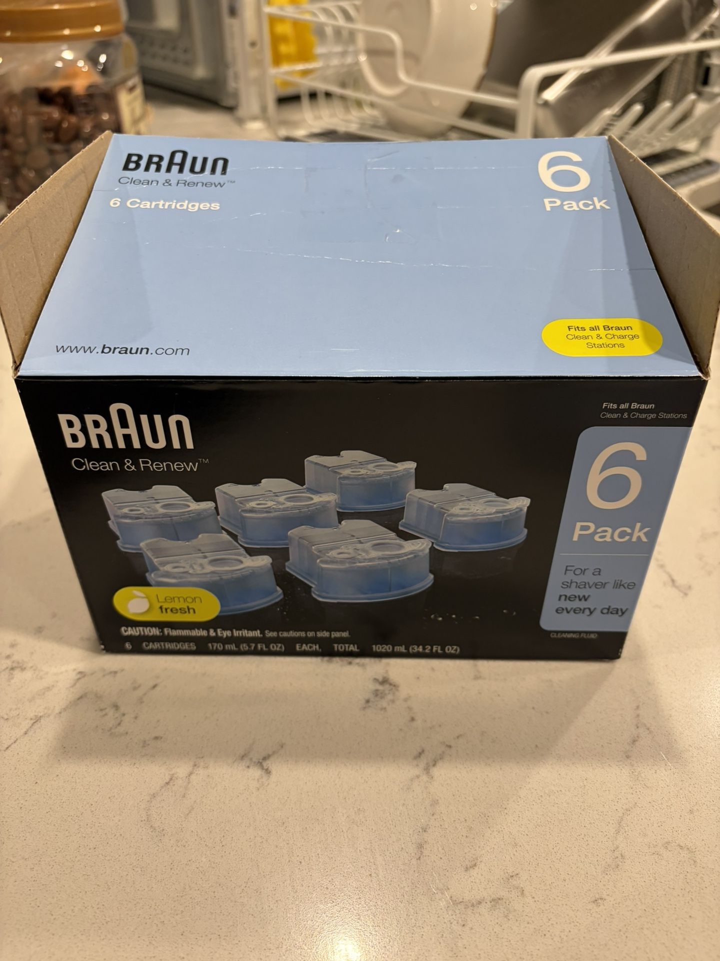 Braun Clean & Renew Refill Cartridges CCR, Replacement Shaver Cleaner Liquid Solution for Clean&Charge System, 5 remaining from a pack of 6. Amazon price is $33 for 6. Alcohol-based cleaning solution cleans, lubricates shaver, provides optimal hygiene, refreshing lemon scent, great shaving experience.