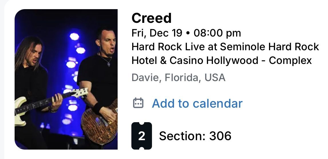 Selling 2 tix for CREED Concert , Dec 19, 2025 8pm at Hardrock Live , Seminole Hardrock Hotel and Casino . Sec 306 great view of stage. $240 bucks .. get em before they’re gone.