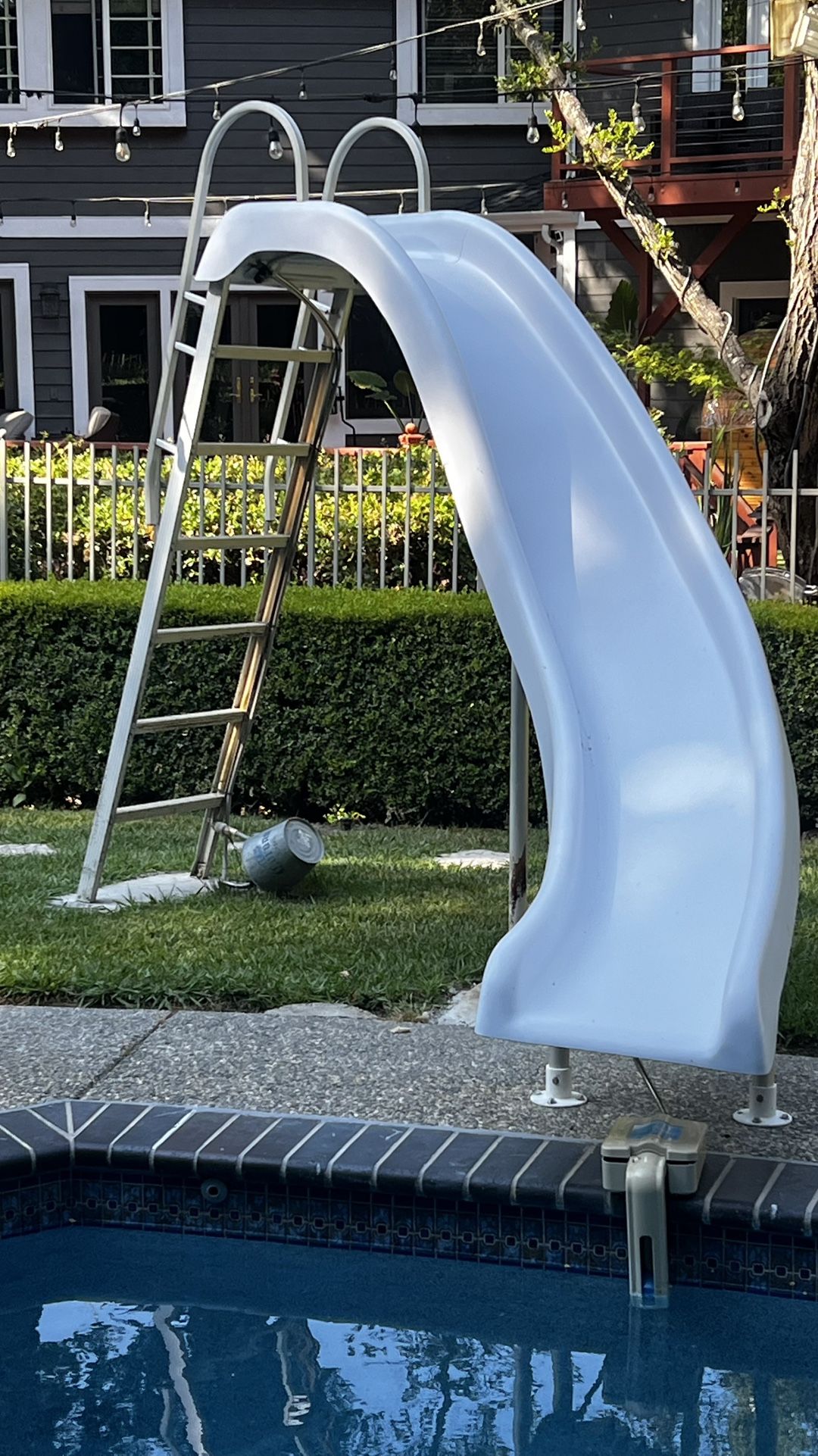 Product Features 8 feet in height (6.5 feet to seat). Weight Limit: 250 pounds 30 GPM maximum water delivery system can be plumbed through the pool's return line or connected to a garden hose. Wide rotomolded flume with high walls
