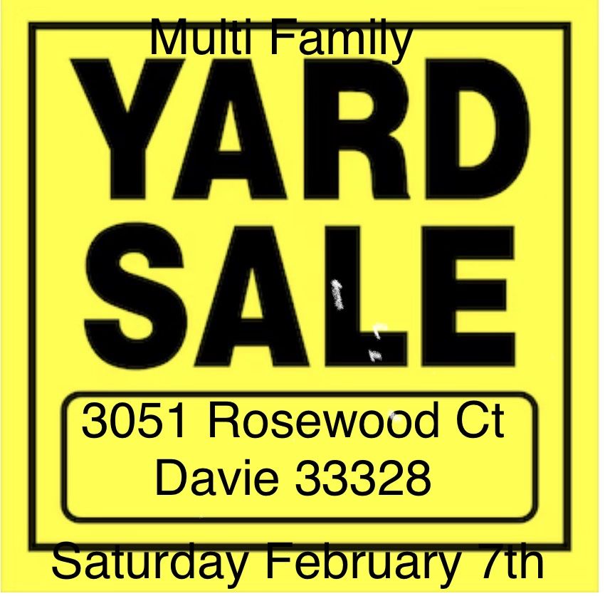 Multi family yard sales Saturday February 7th at 3051 Rosewood Ct Davie 33328. Toys, tools, clothes, furniture, tvs, kitchen wares, electronics, plants, linen, collectables, costume jewelry, art, pet items, old and new.