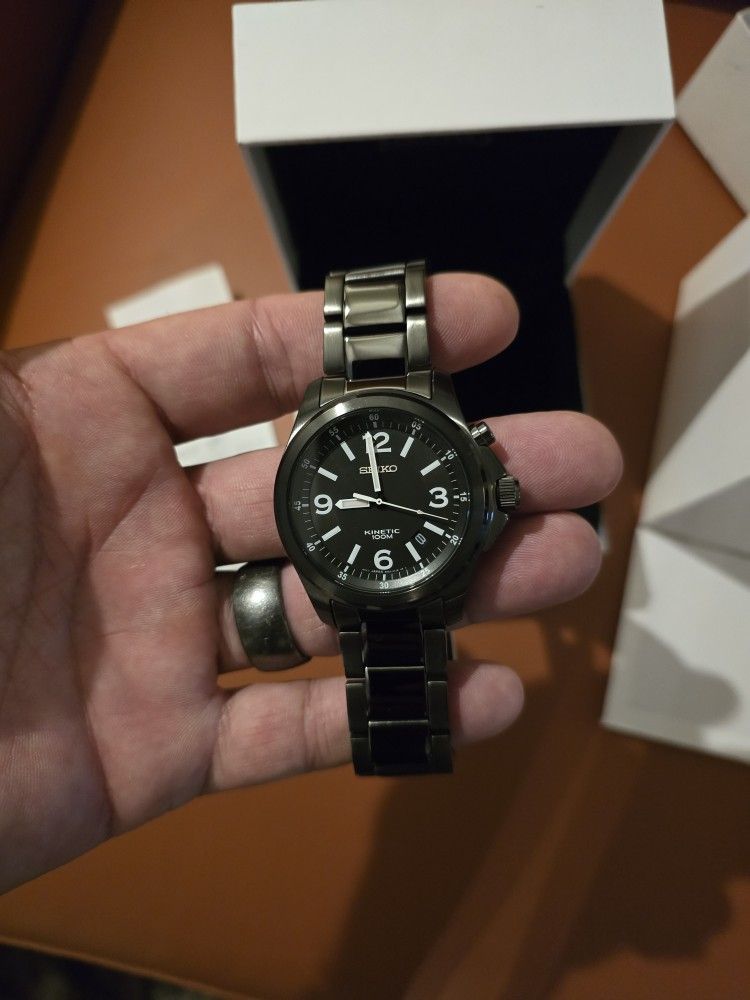 SKA465 Black ion-plated stainless steel case and bracelet. Fixed black ion-plated bezel. Black dial with luminous hands and index hour markers. Arabic numerals mark the 3, 6, 9 and 12 o'clock positions. Minute markers around the outer rim. Luminescent hands and markers. Date display between 4 and 5 o'clock positions. Kinetic movement. Scratch resistant mineral crystal. Transparent case back. Case diameter: 40 mm. Case thickness: 12 mm. Round case shape. Fold over clasp with safety release. Water resistant at 100 meters / 330 feet. Functions: date, hour, minute, second. Casual watch style. Seiko Kinetic Black Ion-plated Men's Watch SKA465.