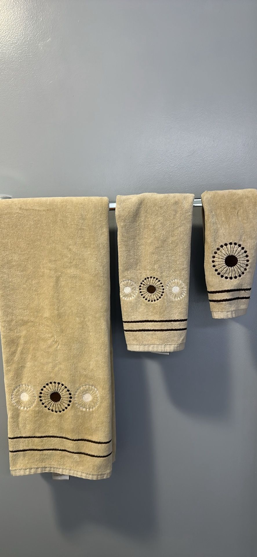 Towel set. One bath towel , one hand towel, and wash cloth Beige and brown