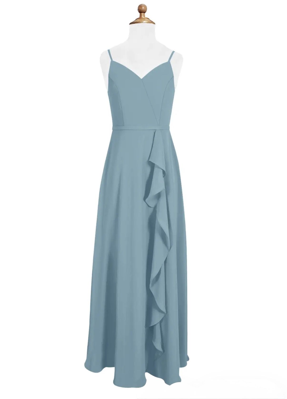 AZAZIE light blue maxi dress with a flowy, boho style #braidsmaid This dress gives a sweet and classy look. Cut from chiffon, she features a faux surplice V- neckline held up by spaghetti straps. A thin self fabric belt accentuates the waist, while a cascading ruffle drape flows down her A-line skirt revealing a leg slit. Length : Floor-Length Fabric : Chiffon (Non-Stretch) Silhouette : A-Line/Princess Sleeves : Sleeveless, Spaghetti Straps Neckline : V-Neck Back style : Back Zip Embellishment : Ruffle