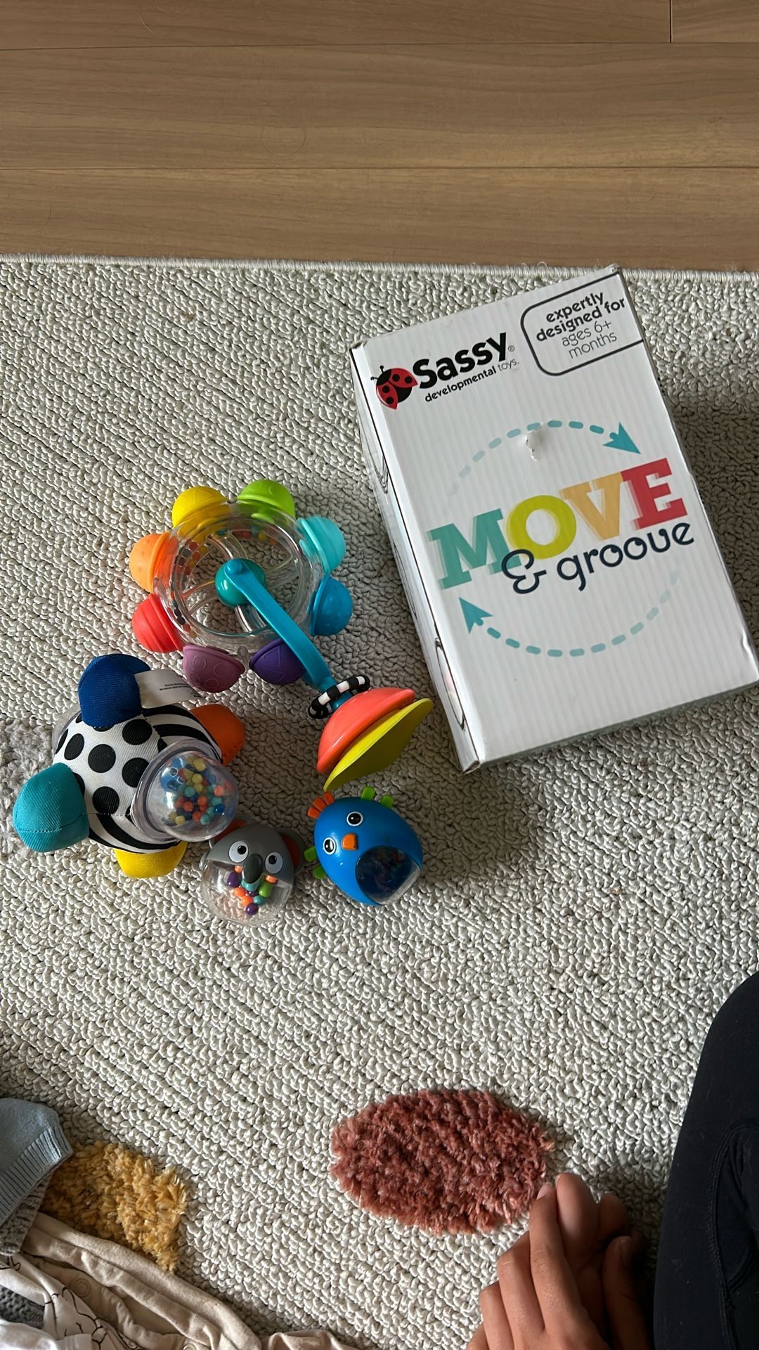 Sassy Developmental Toys Expertly designed for ages 6+ months Move & Groove Rainbow wheel Bumpy ball Shaker pals Originally $31