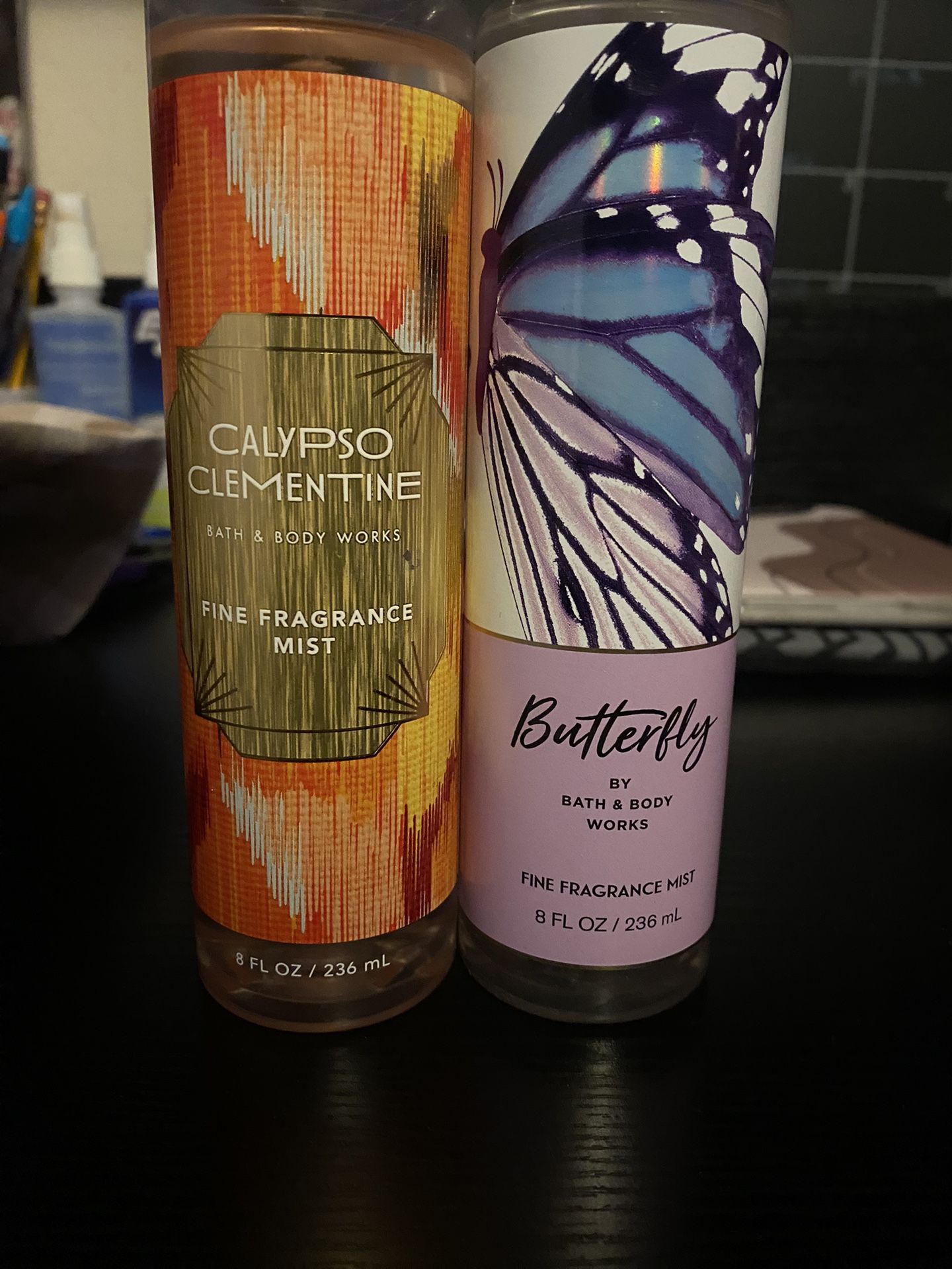 Butterfly and Calypso Clementine body mists never used. Smells really good. $10 each or take both for $20. Originally $20 each in store.