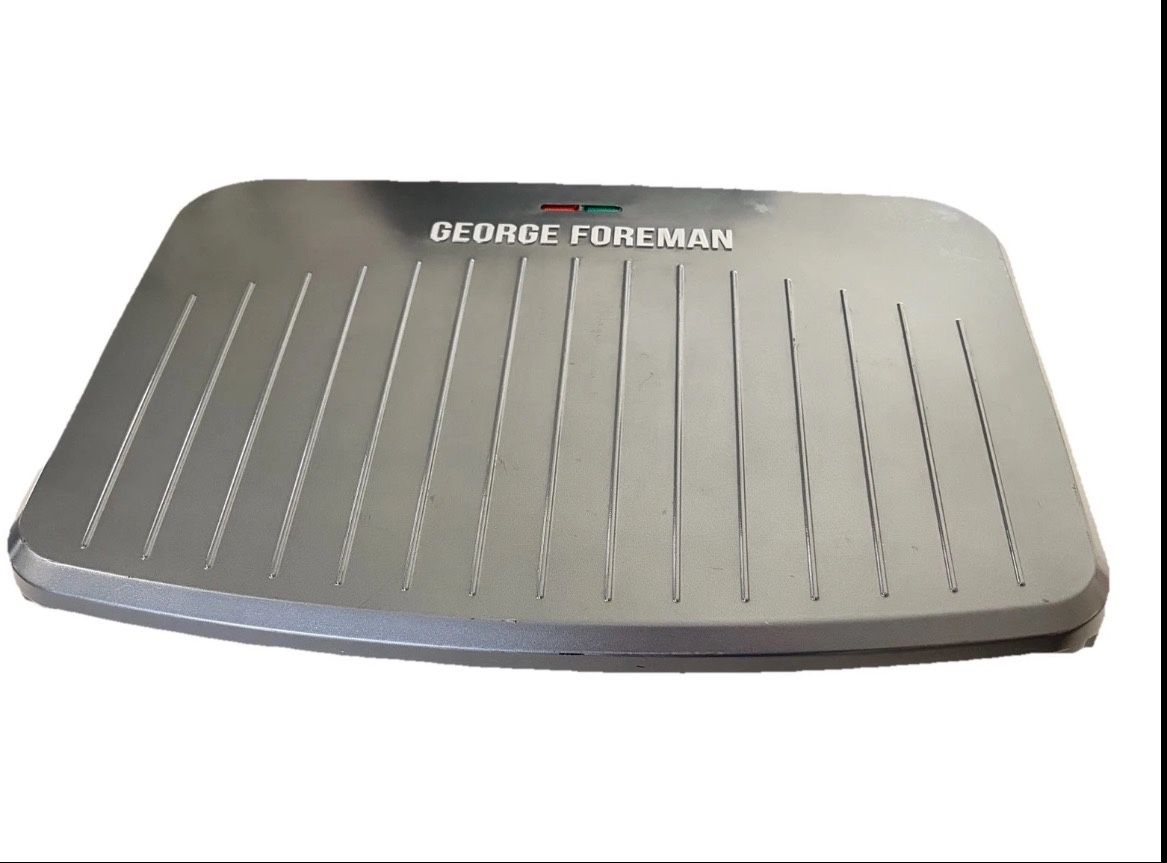***Please see all pictures for details. Has cosmetic wear/scratches throughout exterior. There is a crack in the bottom right side of the leg/casing; does not affect function. Unit is tested and functions well. See all pictures for details. **** George Foreman 9-Serving Plate Electric Indoor Grill & Panini Press GRS120GT - No drip tray