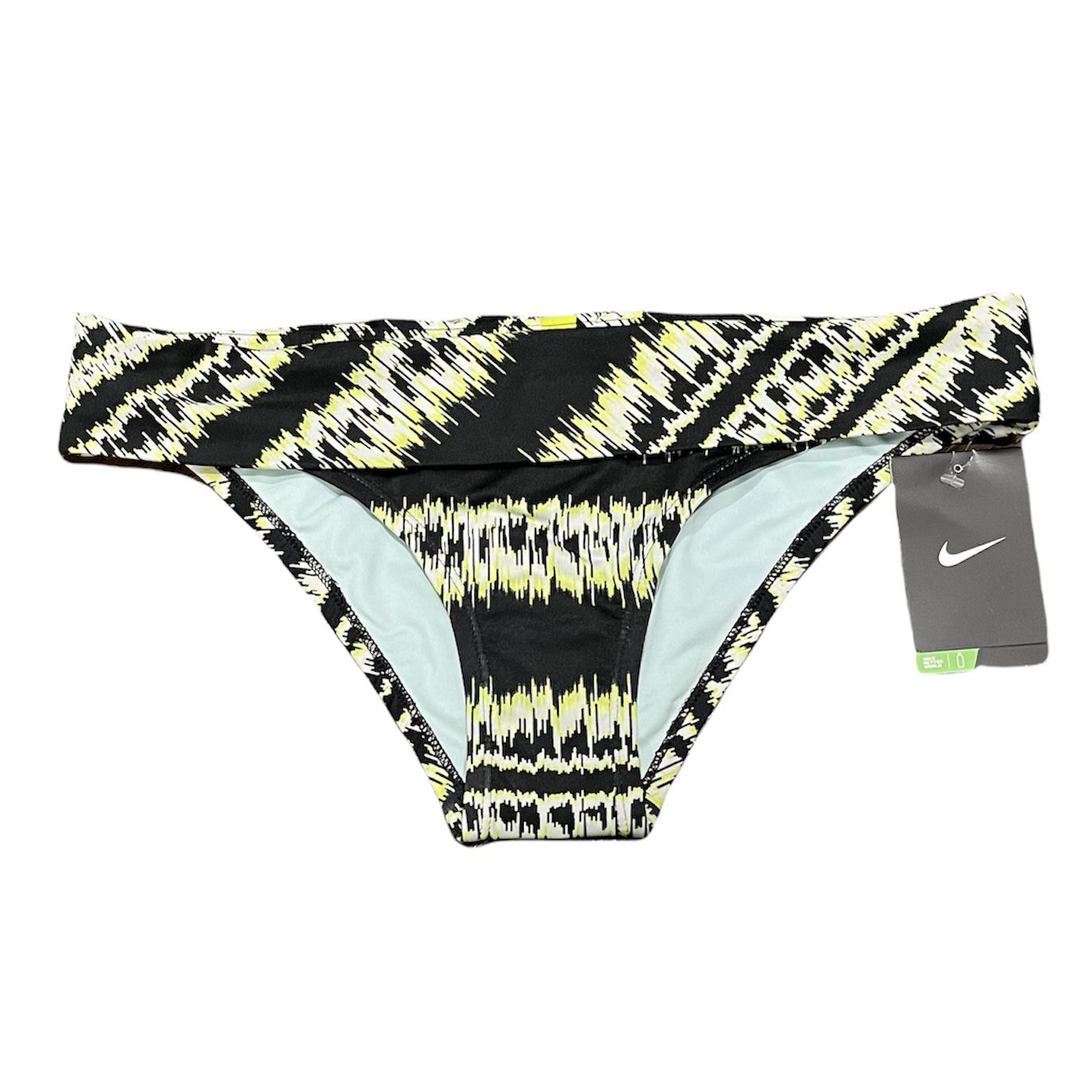 New with tag, never been worn - no flaws. Splice through clear waters in this Nike Brush Stripe Bikini Brief! Nike NX fabric is a chlorine-resistant nylon fabric that is durable, colorfast and has excellent shape retention. Foldover waistband with tab accent at back. Bonded silicone leg grippers Cheeky rear coverage Tie-dye stripes Lined Color: Venom Green