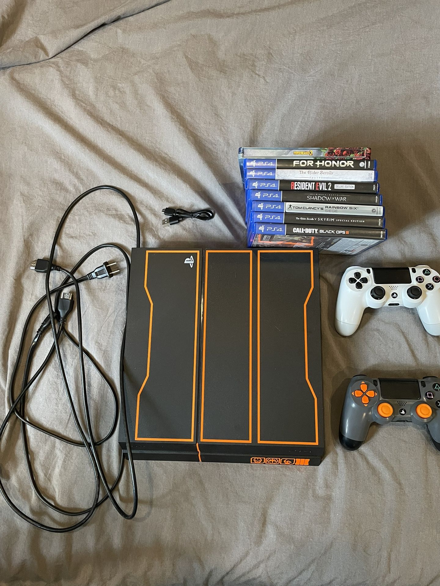 1TB PS4 black ops edition. Regular 8 PS4 games shown in picture 2 PS4 controllers Comes with all cords Willing to meet halfway