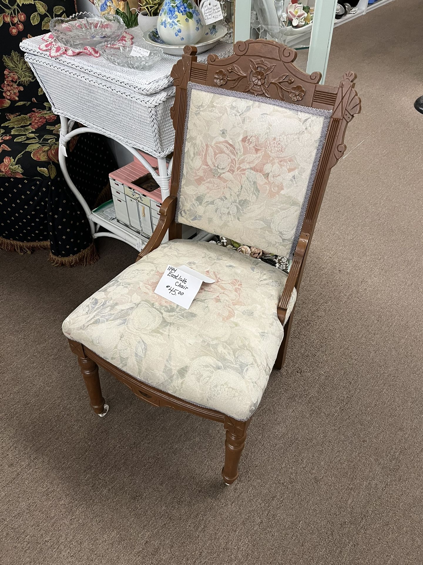 Eastlake floral upholstered single chair. This can be found in booth A12. See photos for location and other info.