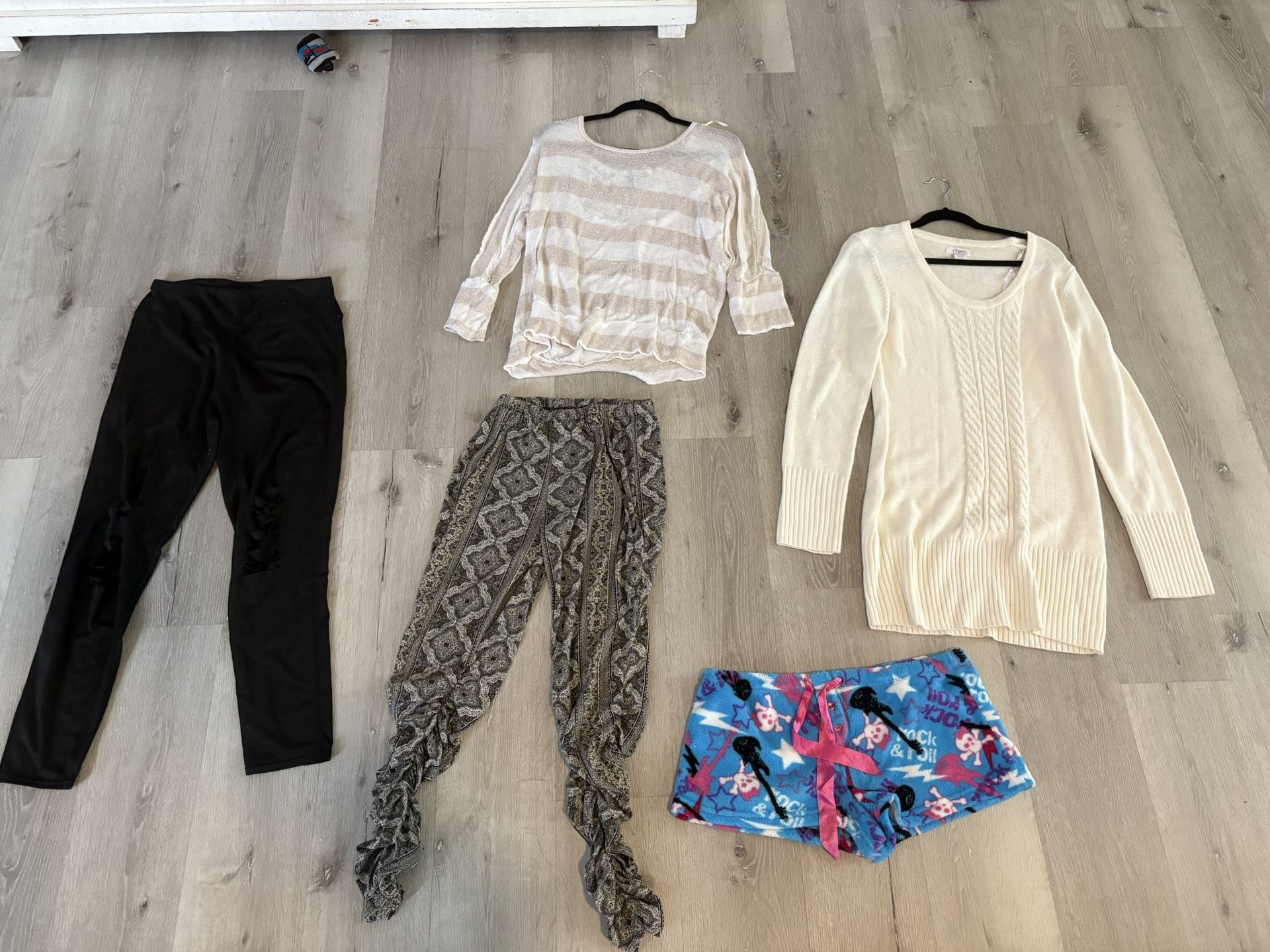Sweater dress Tan top with lace back Brown pants Black leggings with slits Soft shorts