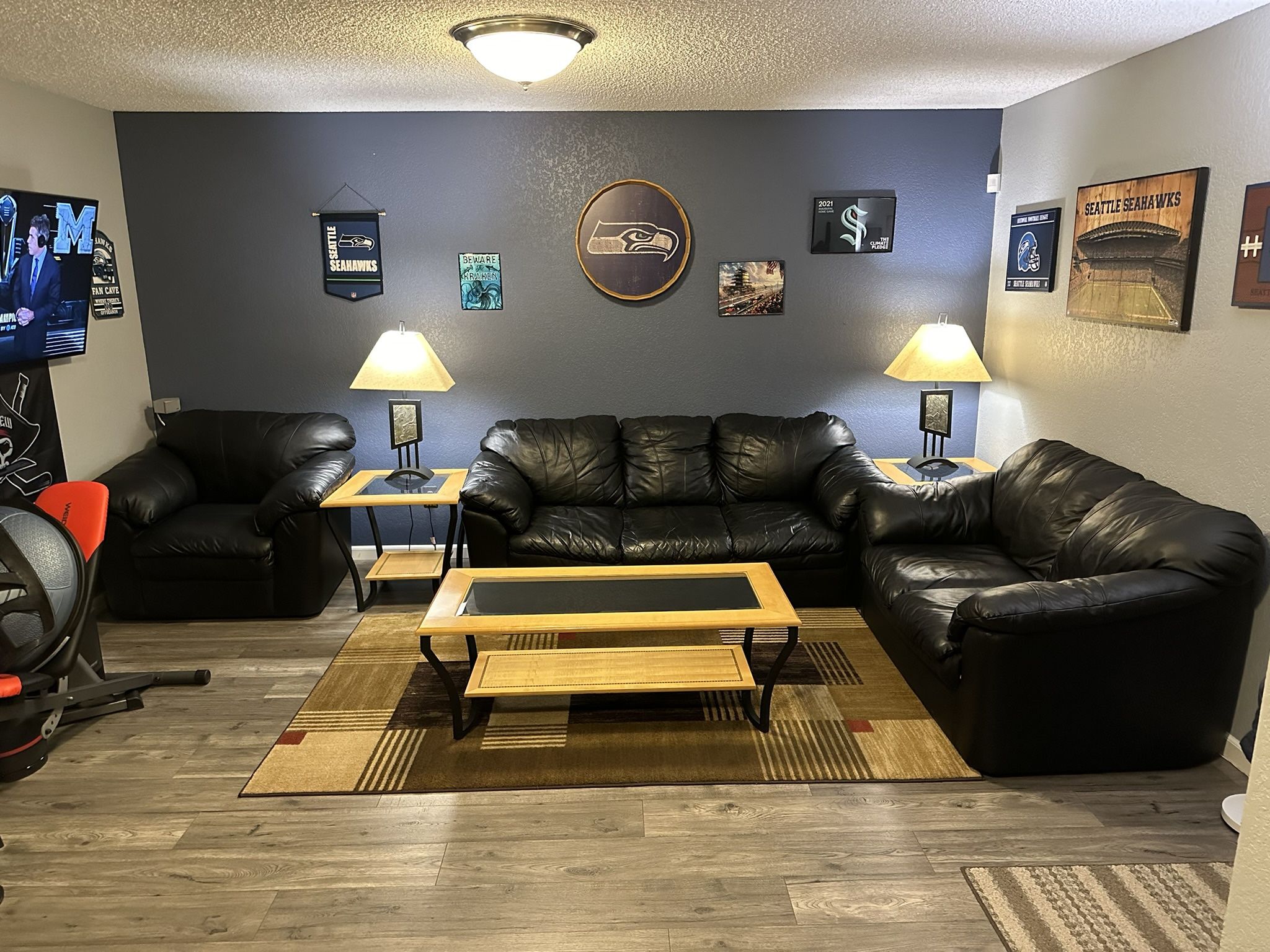 Leather couch, sofa, loveseat and captains chair Glass top coffee table and 2 end tables 2 Modern lamps, lights with shades. 1 shade slightly cracked. All Ashley Furniture except included rug