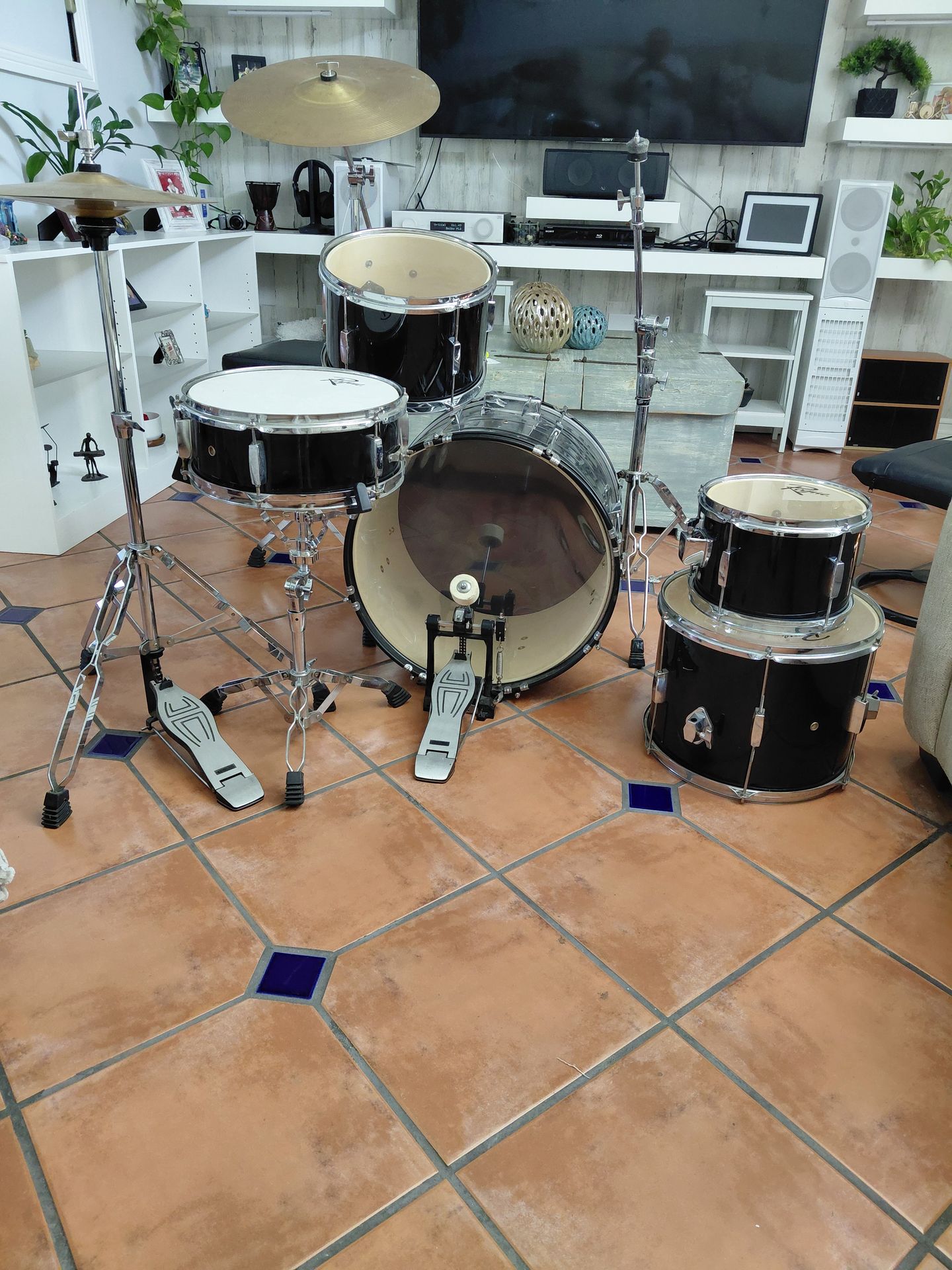 Used Rogue Jr. 5-piece black drum set with hardware and symbals . The bass drum legs and tom legs are missing, as seen in the photos. All the drumheads are like new. The bass drum vinyl is slightly wrinkled (I don't know why), and the screws are a little rusty (I don't know why, probably because it's been stored in a room). It needs a little TLC