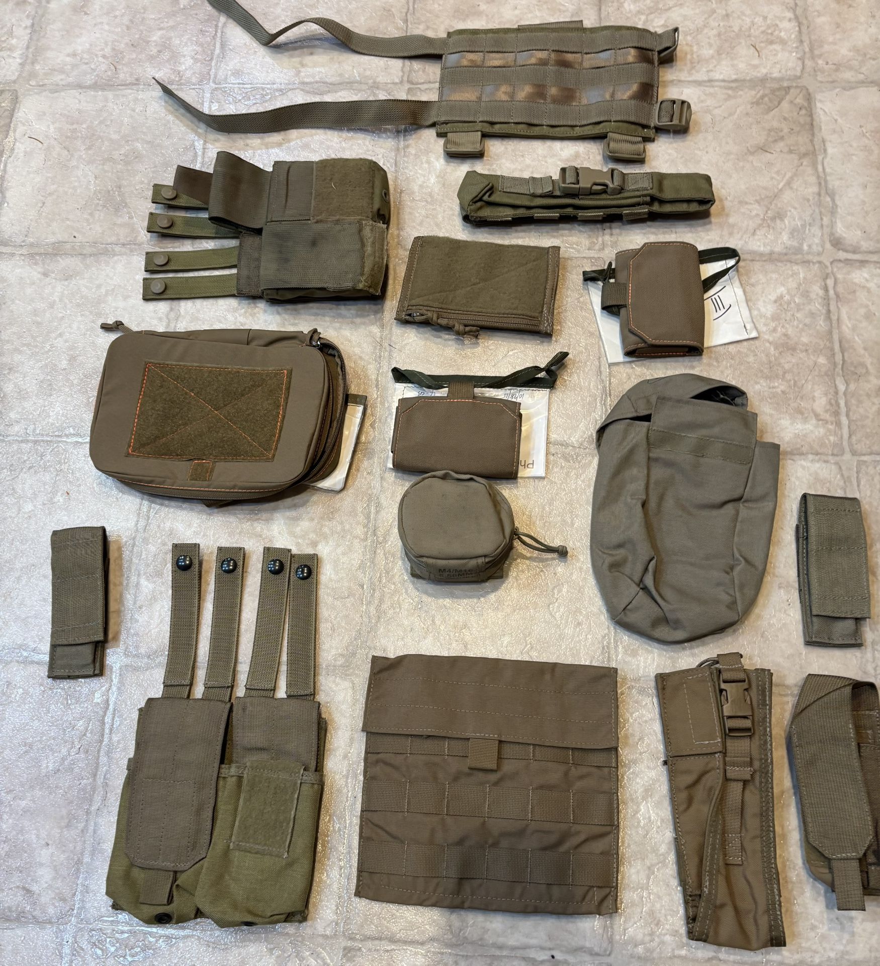 Group of surplus tactical pouches, cases, weapons cleaning kit, side plates, mag pouches all in good used condition. $10 each or $75 for the lot. Plenty of other tactical pouches, gear, accessories available in coyote, FDE, black, Ranger Green, multicam, and other schemes.
