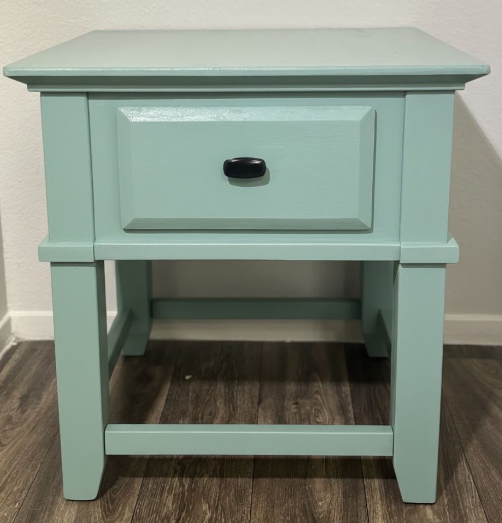 Custom-refinished nightstand in Australian Jade Green. This is a heavy, high-quality wood piece from the discontinued Protege collection from Ashley’s Furniture. Excellent condition and comes from a smoke-free home. Details: •Dimensions: 24"W x 24"D x 25.75"H •Condition: Clean drawer, smooth glides, original hardware, and manufacturing tag intact. Price: $180 OBO Delivery: Free local delivery if purchased at full price. Message to schedule pickup or delivery. Serious buyers only.