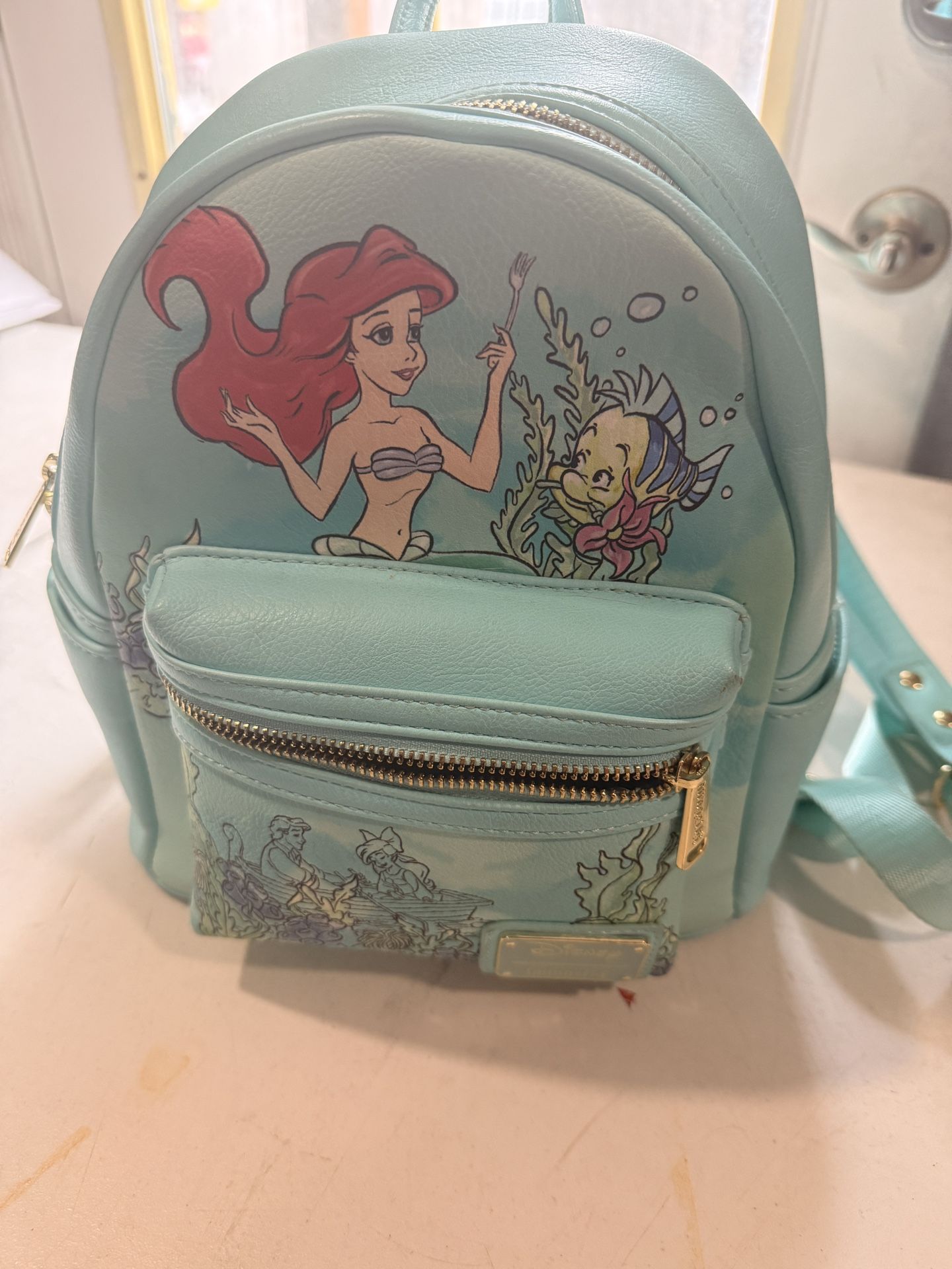 Officially licensed Disney merchandise Printed, stitched and embroidered Ariel and Flounder underwater Contains 1 large main compartment + 1 small compartment on front of backpack Adjustable shoulder straps for added comfort and support Interior lining matches exterior theme Finished with signature Loungefly enamel badge Made with vegan friendly faux leather