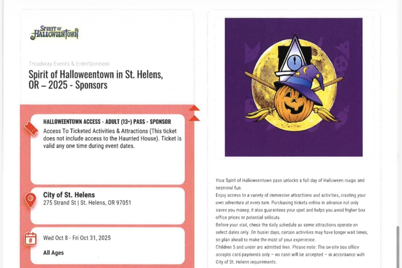 Original price was $48 Adult (13+) Halloween Access Bundle Your all-day pass to Spirit of Halloweentown includes entry to all official attractions for one magical day. Step inside the kid-friendly Haunted House, explore the Masonic Building's signature attractions (past favorites have included an alien encounter, an oddities museum, and other surprises), enjoy seasonal fun in the Harvest Games Zone, and relax at the Boo Bash Pavilion with themed entertainment and photo ops. Climb aboard the train for a scenic Filming Location Tour through St. Helens, then take home a digital photo with Jack