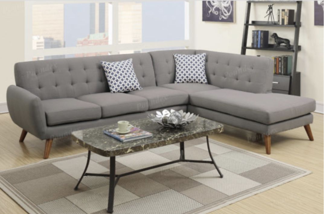 An uptown state of mind, this 2-piece sectional is for the hipster with a unique sense of style. Tightly upholstered with accent tufting on the back supports, this sectional also features a chaise and accent pillows. Sectional Sofa Item # F6953 Color: Grey Available in Grey, Ash black & Laguna Some Assembly Required Materials: Polyfiber Pine Wood Wooden leg Dimensions: Sectional: 111″ x 80″ Chaise: 80″ x 35″ x 33″ Sofa: 76″ x 35″ x 33″H *Chaise is Not Reversible