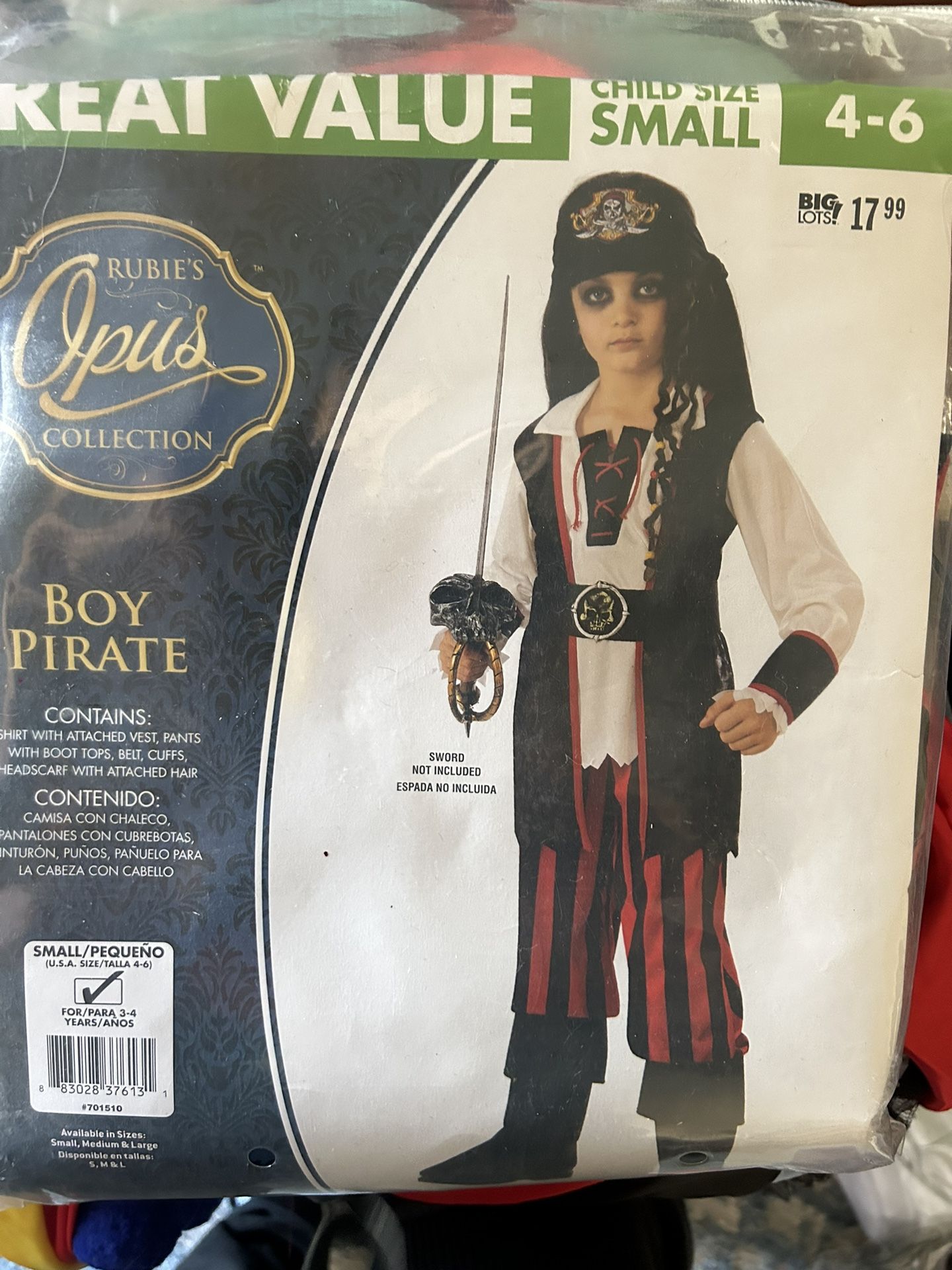 Brand new boys pirate costume .. size 4-6 .. $10