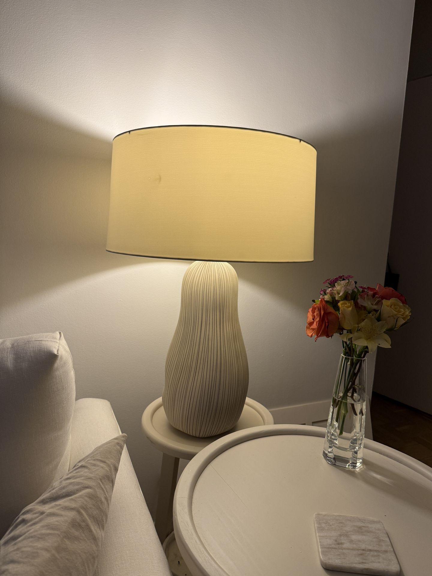 Beautiful textured ceramic table lamp (2 available) in soft ivory with a sculptural base and subtle dotted pattern that adds interest while keeping a calm neutral look. The large drum shade gives off warm, soft lighting and works perfectly in a living room, bedroom, or reading corner. Designer-style look similar to Pottery Barn / West Elm lamps. Purchased at a boutique furniture shop in East Hampton. Details: • Ivory textured ceramic base • Large drum shade included • Approx. 27” tall with shade • Excellent condition • Neutral color works with modern, Japandi, coastal, or minimalist interiors From a clean, smoke-free home. Pickup preferred.