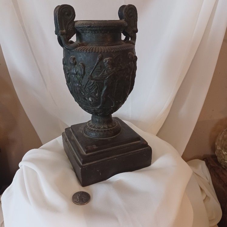 Mid 20th Century, cast metal vase, reproduction Greco-Roman style urn, wood stand