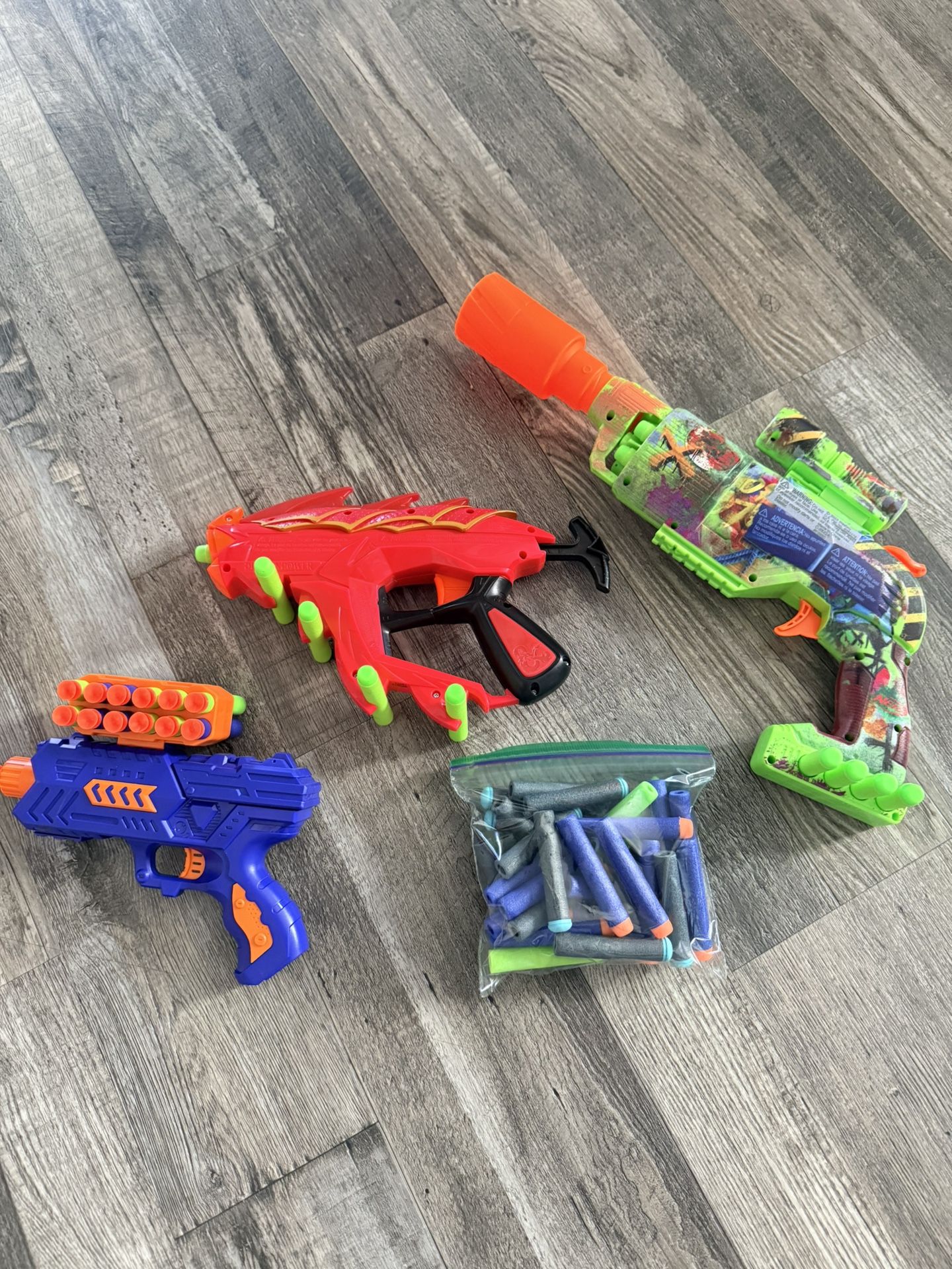 3 nerf guns ready to pepper your house with flying projectiles… great for sibling rivalry including a 5 shooter with scope for the child you love more:) enjoy the family war together