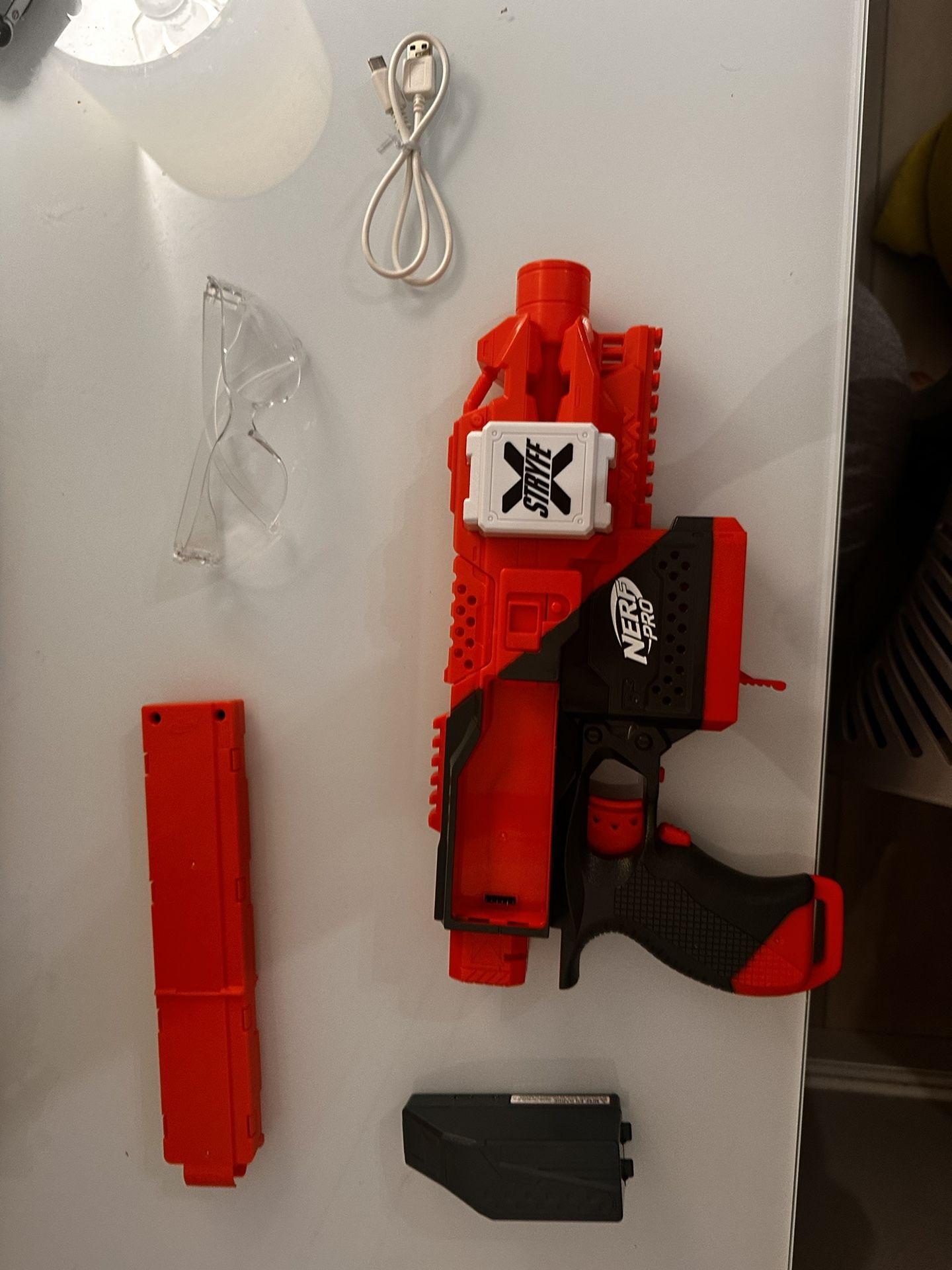 Nerf Stryfe X pro flywheel blaster comes with rechargeable LiPo battery and charge as well as a 15 round magazine. No darts included clocks in at 150 FPS eyeglasses required and are included price is firm no trades
